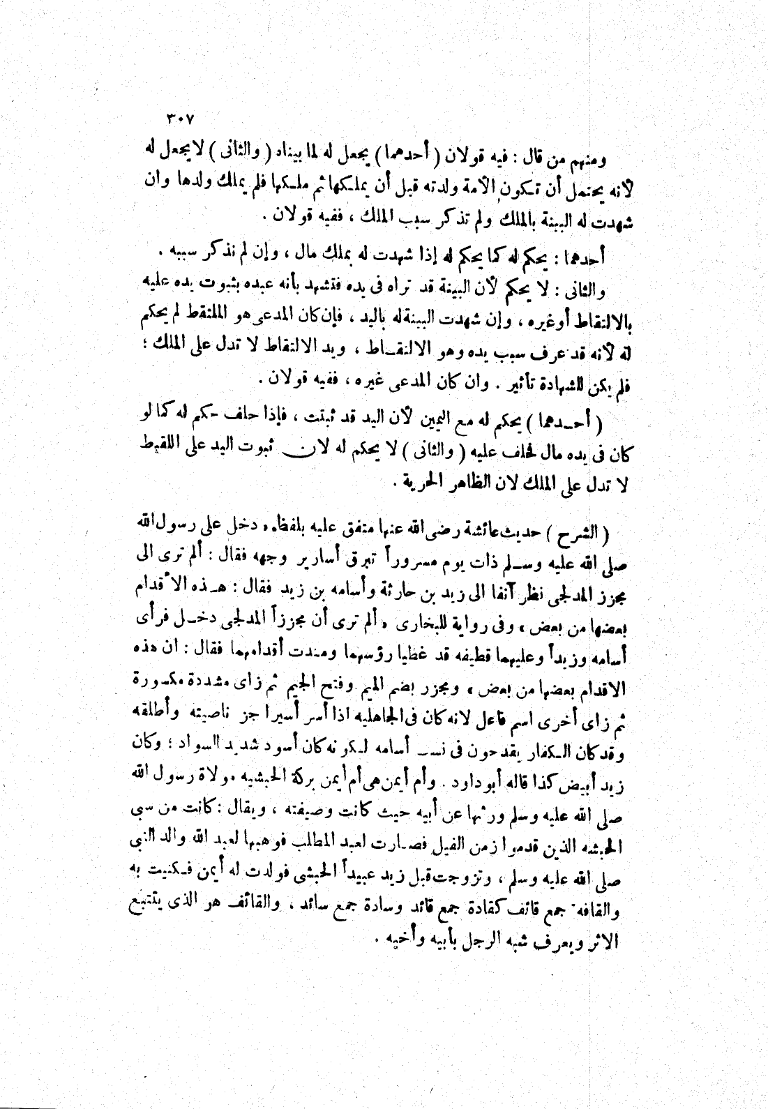 (الشرح) حديث عائشة رضى الله عنها متفق عليه بلفظ (دَخَلَ عَلَى رَسُولِ اللَّهِ صَلَّى اللَّهُ عَلَيْهِ وَسَلَّمَ ذات يوم مسرورا تبرق أسارير وجهه فقال: ألم ترى إلى مجزز المدلجى نظر آنفا إلى زيد بن حارثة وأسامه بن زيد فقال: هذه الاقدام بعضها من بعض) وفى رواية للبخاري (ألم ترى أن مجززا المدلجى دخل فرأى أسامه وزيدا وعليهما قطيفة قد غطيا رؤسهما ومدت أقدامهما فقال: ان هذه