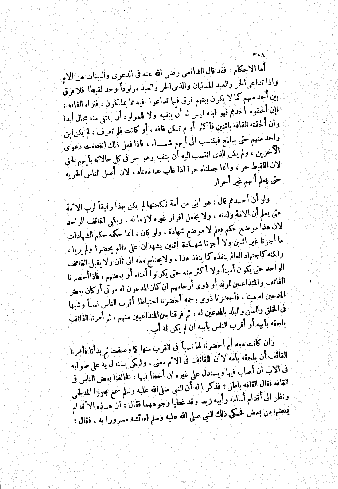 أما الاحكام: فَقَدْ قَالَ الشَّافِعِيُّ رَضِيَ اللَّهُ عَنْهُ فِي الدعوى والبينات من الام وإذا تداعى الحر والعبد المسلمان والذمى الحر والعبد مولودا وجد لقيطا فلا فرق بين أحد منهم كما لا يكون بينهم فرق فيما تداعوا فيه مما يملكون: فتراه القافه، فإن ألحقوه بأحدهم فهو ابنه ليس له أن ينفيه ولا للمولود أن ينتفى منه بحال أبدا وان ألحقته القافه باثنين فأكثر أو لم تكن قافه، أو كانت فلم تعرف، لم يكن ابن واحد منهم حتى يبلغ فينتسب إلى أيهم شاء، فإذا فعل ذلك انقطعت دعوى الآخرين، ولم يكن للذى انتسب إليه أن ينفيه وهو حر في كل حالاته بأيهم لحق لان اللقيط حر، وانما جعلناه حرا إذا غاب عنا معناه، لان أصل الناس الحريه حتى يعلم أنهم غير أحرار ولو أن أحدهم قال: هو ابني من أمة نكحتها لم يكن بهذا رقيقا لرب الامة حتى يعلم أن الامة ولدته، ولا يجعل اقرار غيره لازما له، ويكفى القائف الواحد لان هذا موضع حكم بعلم لا موضع شهادة، ولو كان، انما حكمه حكم الشهادات