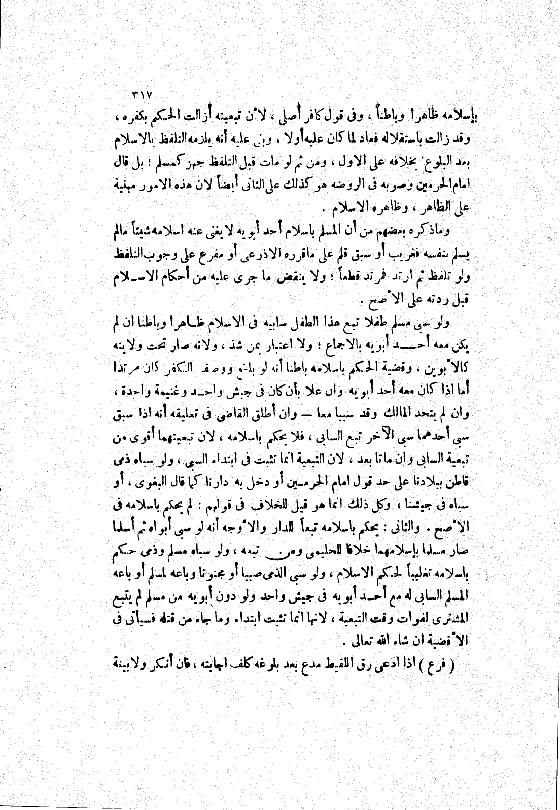 ولو سبى مسلم طفلا تبع هذا الطفل سابيه في الاسلام ظاهرا وباطنا ان لم يكن معه أحد أبويه بالاجماع، ولا اعتبار بمن شذ، ولانه صار تحت ولايته كالابوين، وقضية الحكم باسلامه باطنا أنه لو بلغ ووصف الكفر كان مرتدا أما إذا كان معه أحد أبويه وان علا بأن كان في جيش واحد وغنيمة واحدة، وان لم يتحد المالك وقد سبيا معا وان أطلق القاضى في تعليقه أنه إذا سبق سبى أحدهما سبى الآخر تبع السابى، فلا يحكم باسلامه، لان تبعيتهما أقوى من تبعية السابى وان ماتا بعد، لان التبعية انما تثبت في ابتداء السبى، ولو سباه ذمى قاطن ببلادنا على حد قول امام الحرمين أو دخل به دارنا كما قال البغوي، أو