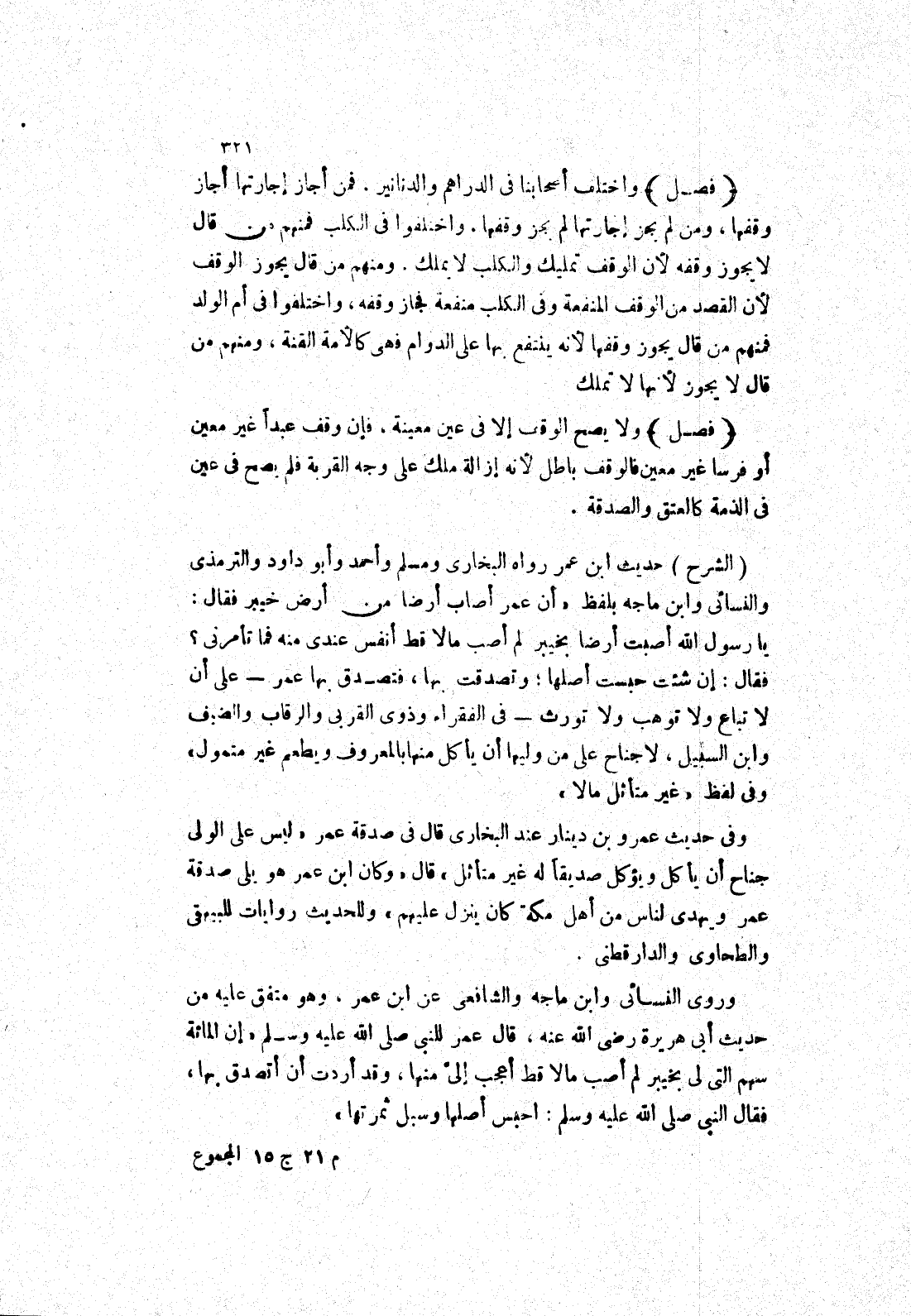 (الشَّرْحُ) حَدِيثُ ابْنِ عُمَرَ رَوَاهُ الْبُخَارِيُّ وَمُسْلِمٌ وأحمد وأبو داود والترمذي والنسائي وابن ماجه بلفظ (أن عمر أصاب أرضا من أرض خيبر فقال: يا رسول الله أَصَبْتُ أَرْضًا بِخَيْبَرَ لَمْ أُصِبْ مَالًا قَطُّ أنفس عندي منه فما تأمرني؟ فقال: إن شئت حبست أصلها، وتصدقت بها، فتصدق بها عمر على أن لا تباع ولا توهب ولا تورث في الفقراء وذوى القربى والرقاب والضيف وابن السبيل، لا جناح على من وليها أن يأكل منها بالمعروف ويطعم غير متمول) وفى لفظ (غير متأثل مالا) وفى حديث عمرو بن دينار عند البخاري قال في صدقة عمر (ليس على الولى جناح أن يأكل صديقا له غير متأثل) قال (وكان ابن عمر هو يلى صدقة عمر ويهدى لناس من أهل مكة كان ينزل عليهم) وللحديث روايات للبيهقي والطحاوى والدارقطني.