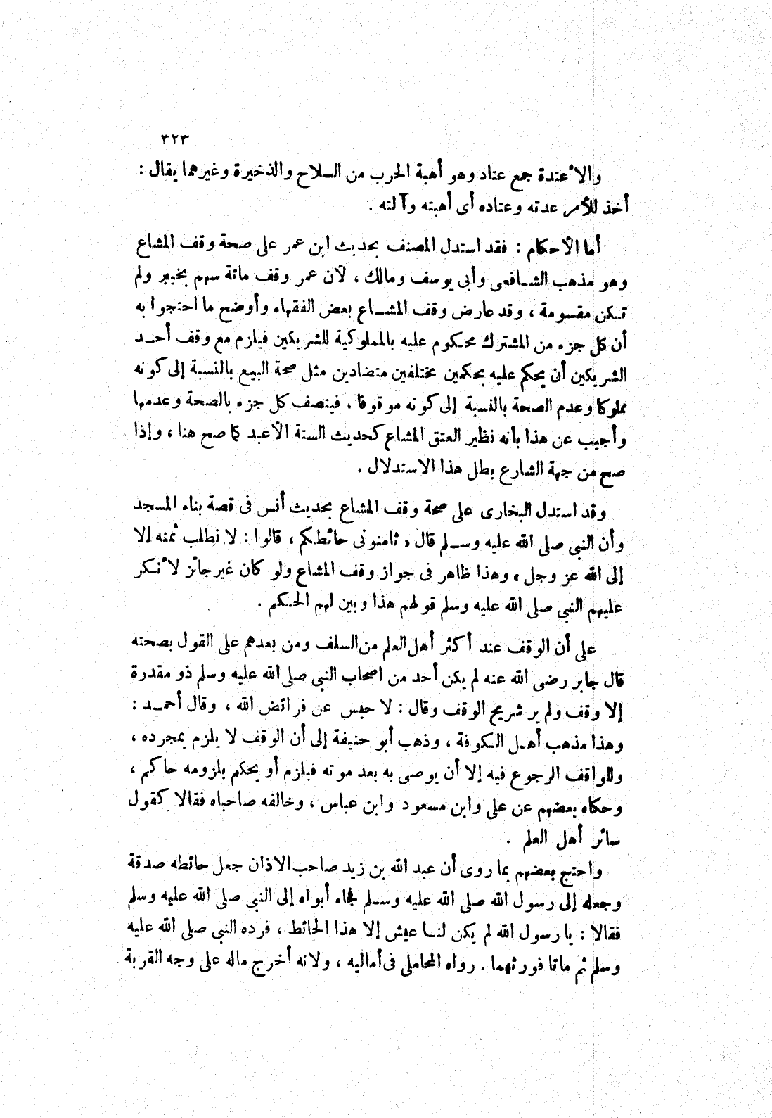 أما الاحكام: فقد استدل المصنف بحديث ابن عمر علب صحة وقف المشاع وهو مذهب الشافعي وأبى يوسف ومالك، لان عمر وقف مائة سهم بخيبر ولم تكن مقسومة، وقد عارض وقف المشاع بعض الفقهاء وأوضح ما احتجوا به أن كل جزء من المشترك محكوم عليه بالمملوكية للشريكين فيلزم مع وقف أحد الشريكين أن عليه بحكمين مختلفين متضادين مثل صحة البيع بالنسبة إلى كونه مملوكا وعدم الصحة بالنسبة إلى كونه موقوفا، فيتصف كل جزء بالصحة وعدمها وأجيب عن هذا بأبه نظير العتق المشاع كحديث الستة الاعبد كما صح هنا، وإذا صح من جهة الشارع بطل هذا الاستدلال.