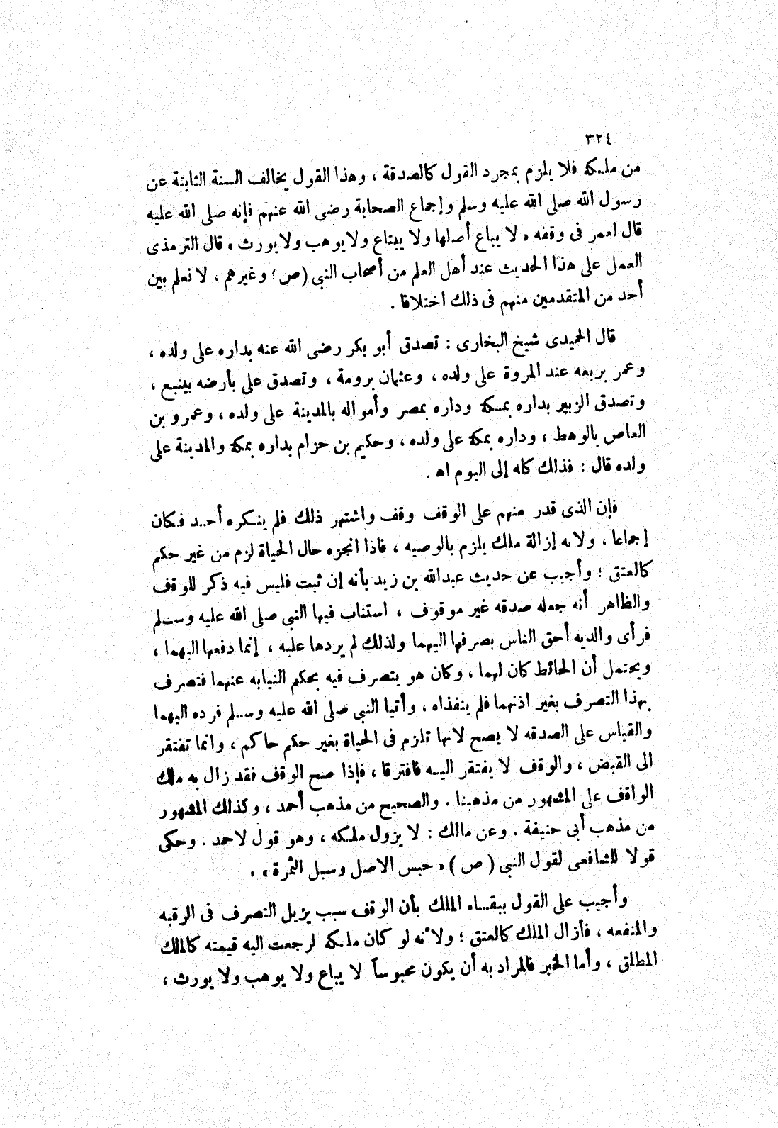 قال الحميدى شيخ البخاري: تصدق أبو بكر رضى الله عنه بداره على ولده، وعمر بربعه عند المروة على ولده، وعثمان برومة، وتصدق على بأرضه بينبع، وتصدق الزبير بداره بمكة وداره بمصر وأمواله بالمدينة على ولده، وعمرو بن العاص بالوهط، وداره بمكة على ولده، وحكيم بن حزام بداره بمكة والمدينة على ولده قال: فذلك كله إلى اليوم اه.