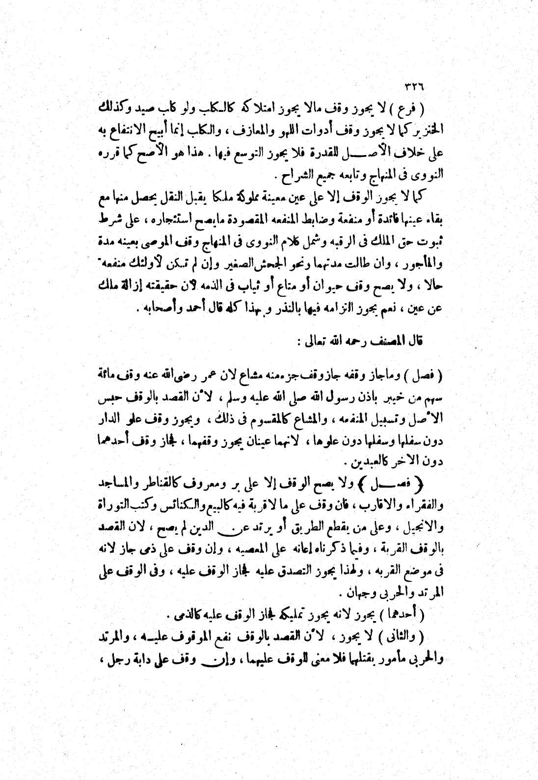 كما لا يجوز الوقف الا على عين معينة مملوكة ملكا يقبل النقل يحصل منها مع بقاء عينها فائدة أو منفعة وضابط المنفعة المقصودة ما يصح استئجاره، على شرط
