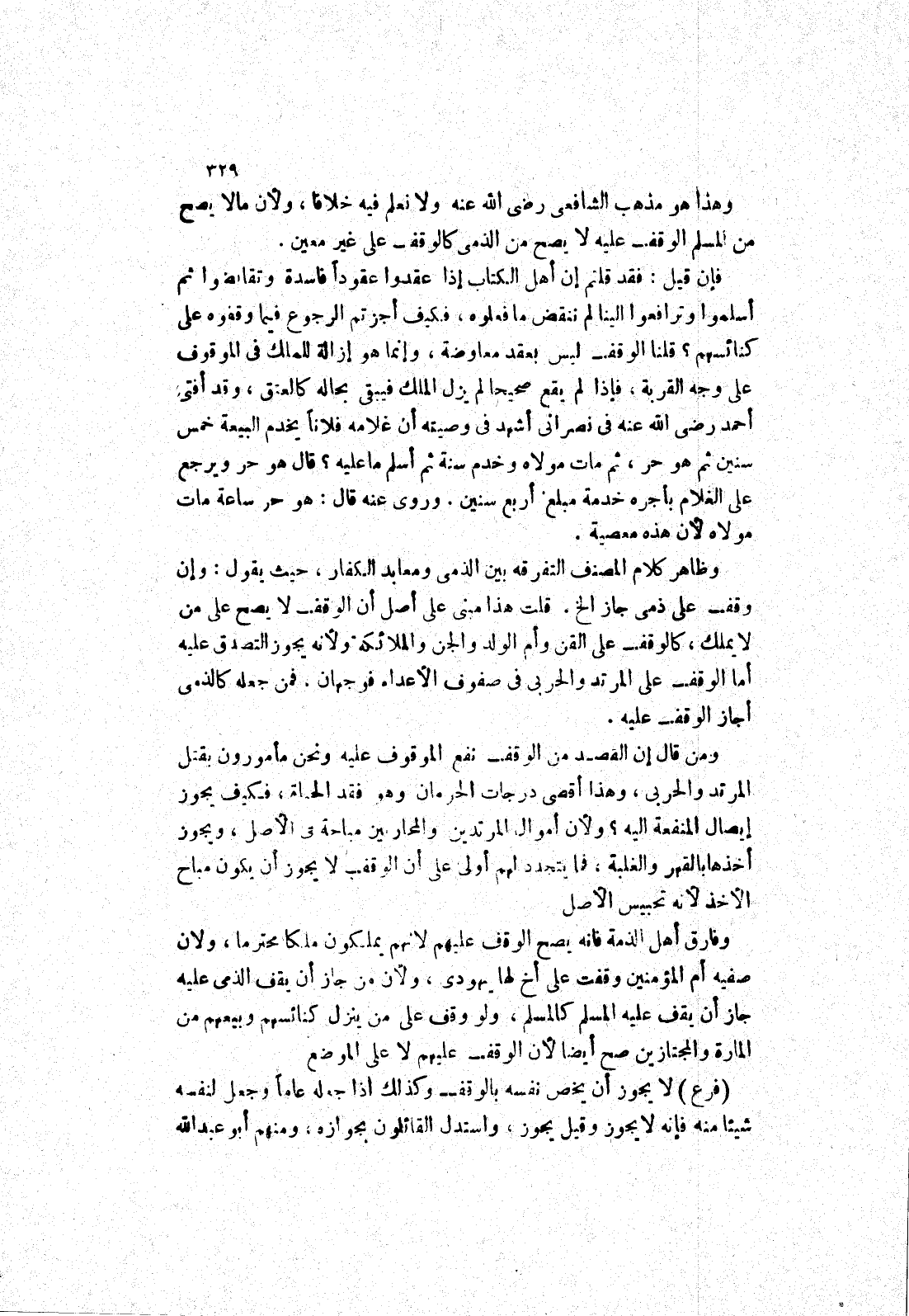 ايصال المنفعة إليه؟ ولان أموال المرتدين والمحاربين مباحة في الاصل، ويجوز أخذها بالقهر والغلبة، فما يتجدد لهم أولى على أن الوقف لا يجوز ان يكون مباح الاخذ لانه تحبيس الاصل وفارق أهل الذمة فانه يصح الوقف عليهم لانهم يملكون ملكا محترما، ولان صفيه ام المؤمنين وقفت على اخ لها يهودى، ولان من جاز أن يقف الذمي عليه جاز أن يقف عليه المسلم كالمسلم، ولو وقف على من ينزل كنائسهم وبيعهم من المارة والمجتازين صح أيضا لان الوقف عليهم لا على الموضع (فرع)