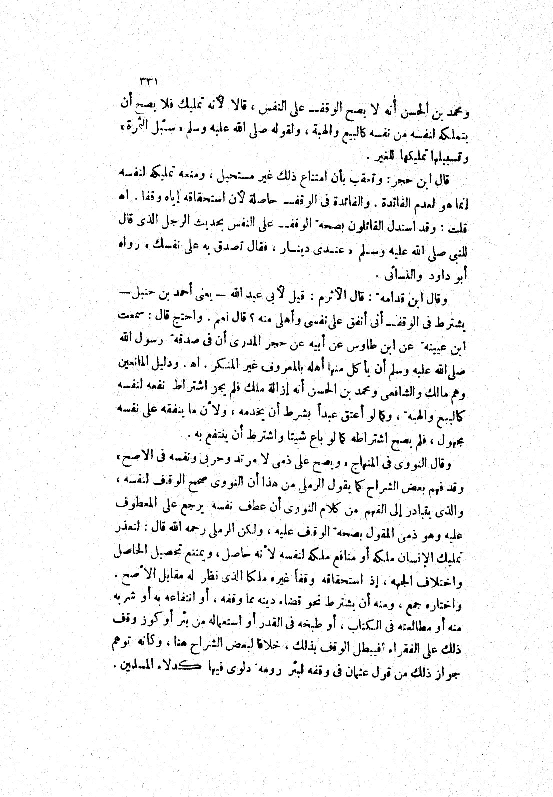 اه قلت: وقد استدل القائلون بصحة الوقف على النفس بحديث الرجل الَّذِي قَالَ لِلنَّبِيِّ صَلَّى اللَّهُ عَلَيْهِ وَسَلَّمَ (عندي دينار، فقال تصدق به على نفسك) رواه أبو داود والنسائي.