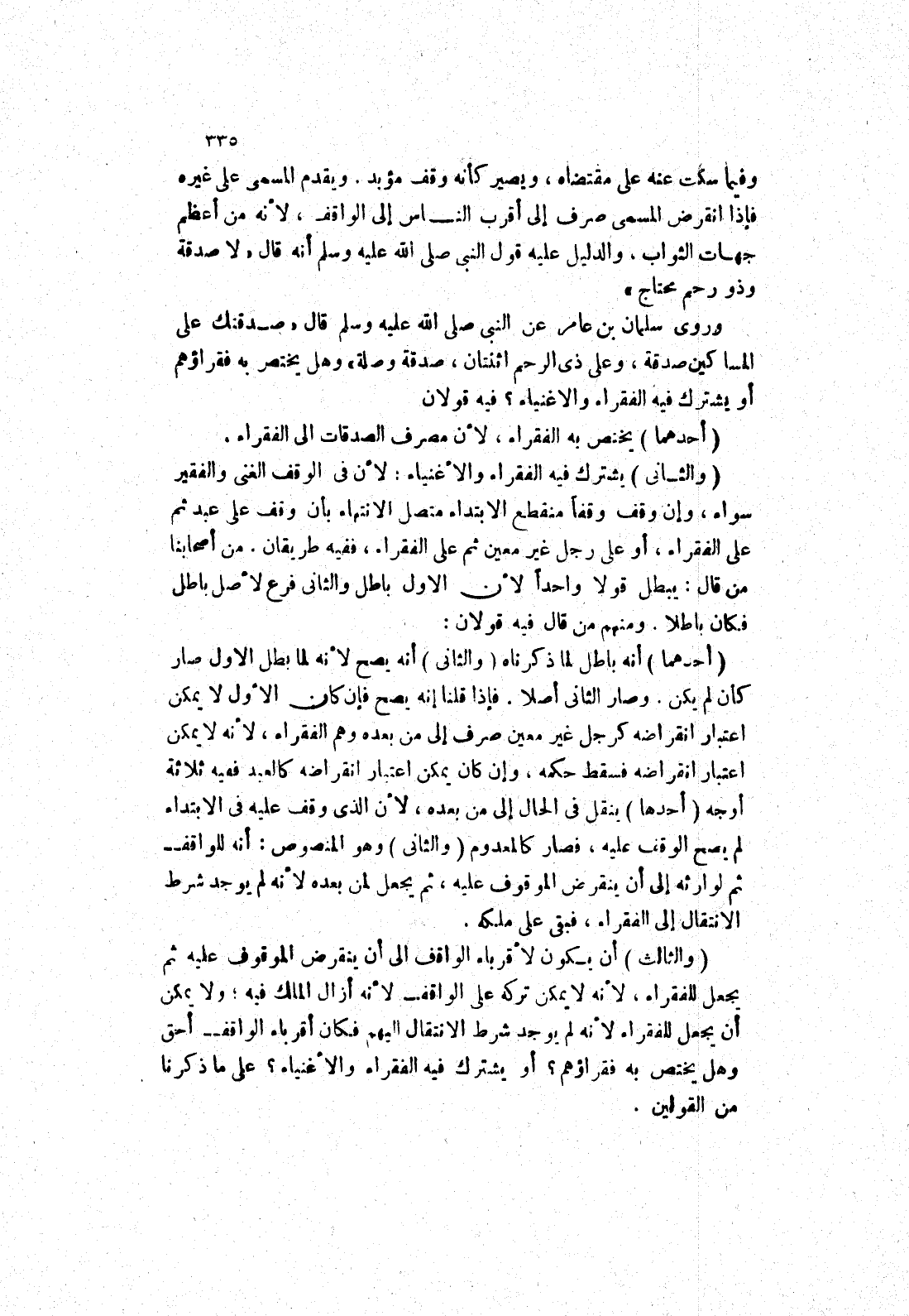 ويقدم المسمى على غيره فإذا انقرض المسمى صرف إلى أقرب الناس إلى الواقف، لانه من أعظم جهات الثواب، والدليل عليه قول النَّبِيِّ صَلَّى اللَّهُ عَلَيْهِ وَسَلَّمَ أَنَّهُ قَالَ (لا صدقة وذو رحم محتاج) وروى سَلْمَانَ بْنِ عَامِرٍ عَنْ النَّبِيِّ صَلَّى اللَّهُ عَلَيْهِ وَسَلَّمَ قَالَ (صدقتك على المساكين صَدَقَةٌ، وَعَلَى ذِي الرَّحِمِ اثْنَتَانِ، صَدَقَةٌ وَصِلَةٌ) وهل يختص به فقراؤهم أو يشترك فيه الفقراء والاغنياء؟ فيه قولان