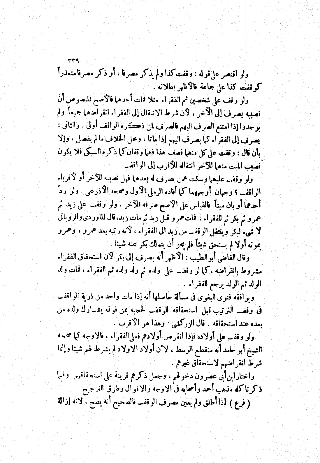 ولو وقف على شخصين ثم الفقراء مثلا فمات احدهما فالاصح المنصوص أن نصيبه يصرف إلى الآخر، لان شرط الانتقال إلى الفقراء انقراضهما جميعا ولم يوجدوا إذا امتنع الصرف إليهم فالصرف لمن ذكره الواقف أولى.