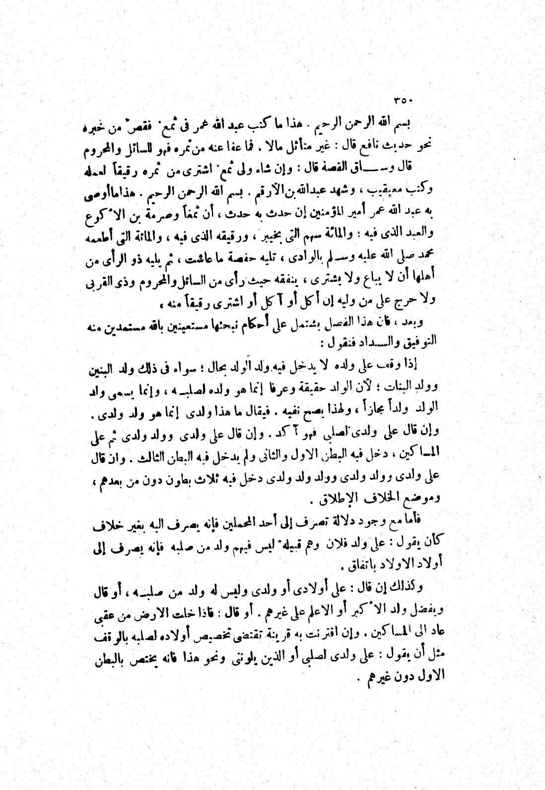 هذا ما أوصى به عبد الله عمر أمير المؤمنين إن حدث به حدث، أن ثمغا وصرمة بن الاكوع والعبد الذى فيه، والمائة سهم التى بخيبر، ورقيقه الذى فيه، والمائة التى أطعمه محمد صلى الله عليه وسلم بالوادي، تليه حفصة ما عاشت، ثم يليه ذو الرأى من أهلها أن لا يباع ولا يشترى، ينفقه حيث رأى من السائل والمحروم وذى القربى ولا حرج على من وليه ان أكل أو آكل أو اشترى رقيقا منه) وبعد، فان هذا الفصل يشتمل على أحكام نبحثها مستعينين بالله مستمدين منه التوفيق والسداد فنقول: إذا وقف على ولده لا يدخل فيه ولد الولد بحال، سواء في ذلك ولد البنين وولد البنات، لان الولد حقيقة وعرفا انما هو ولده لصلبه، وانما يسمى ولد الولد ولد مجازا، ولهذا يصح نفيه.