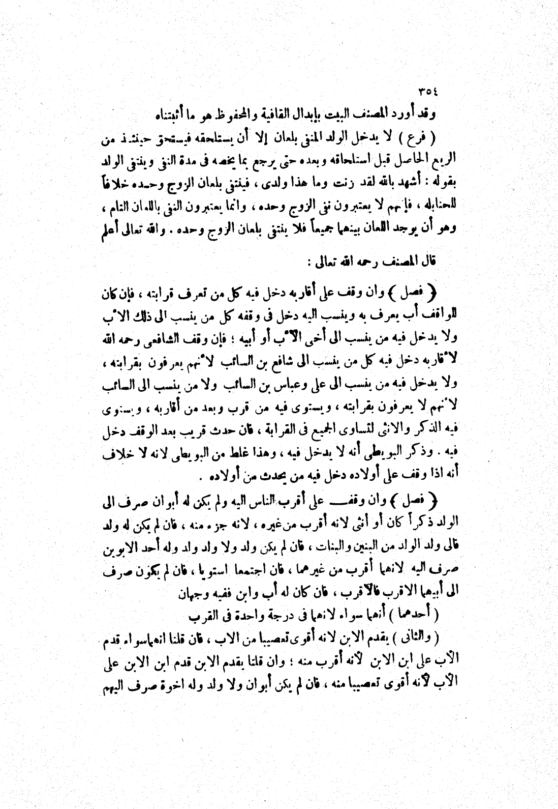 وان وقف على أقاربه دخل فيه كل من تعرف قرابته، فإن كان للواقف أب يعرف به وينسب إليه دخل في وقفه كل من ينسب إلى ذلك الاب ولا يدخل فيه من ينسب إلى أخى الاب أو أبيه، فإن وقف الشافعي رحمه الله لاقاربه دخل فيه كل من ينسب إلى شافع بن السائب لانهم يعرفون بقرابته، ولا يدخل فيه من ينسب إلى على وعباس بن السائب ولا من ينسب إلى السائب لانهم لا يعرفون بقرابته، ويستوى فيه من قرب وبعد من أقاربه، ويستوى فيه الذكر والانثى تساوى الجميع في القرابة، فان حدث قريب بعد الوقف دخل فيه.