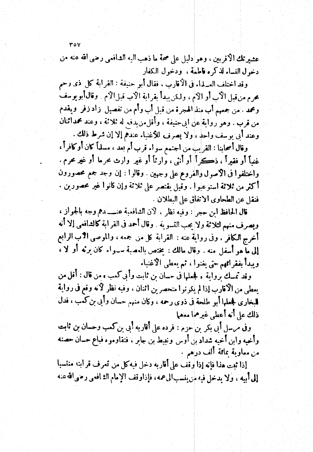 إذا ثبت هذا فإنه إذا وقف على أقاربه دخل فيه كل من تعرف قرابته منتسبا إلى أبيه، ولا يدخل فيه من ينسب إلى عمه، فإذا وقف الامام الشافعي رضى الله عنه