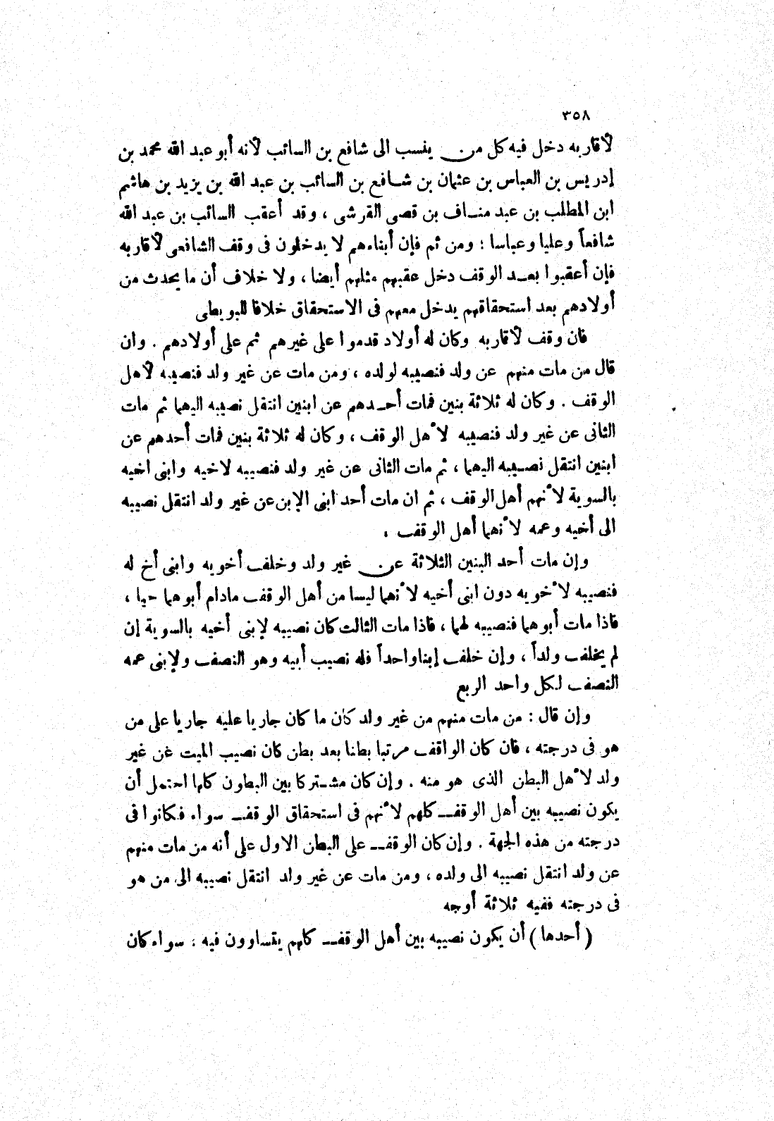 شافعا وعليا وعباسا، ومن ثم فإن أبناءهم لا يدخلون في وقف الشافعي لاقاربه فإن أعقبوا بعد الوقف دخل عقبهم مثلهم أيضا، ولا خلاف أن ما يحدث من أولادهم بعد استحقاقهم يدخل معهم في الاستحقاق خلافا للبويطى فان وقف لاقاربه وكان له أولاد قدموا على غيرهم ثم على أولادهم.