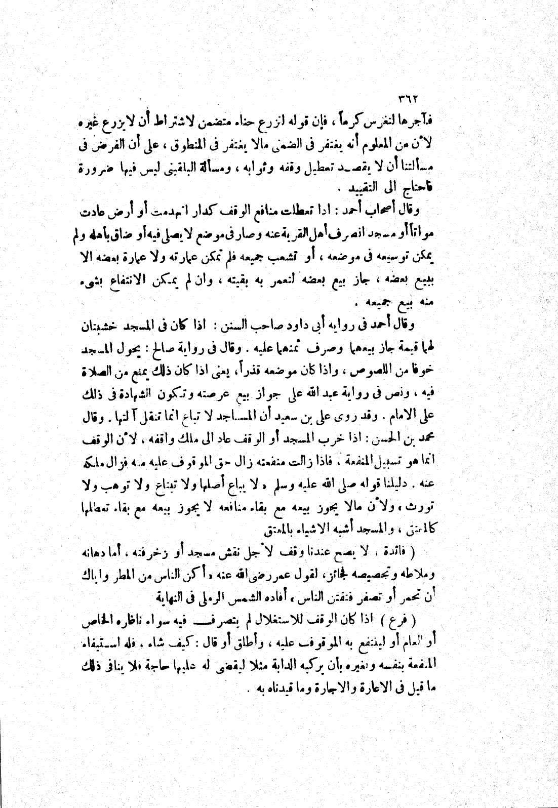 دَلِيلُنَا قَوْلُهُ صَلَّى اللَّهُ عَلَيْهِ وَسَلَّمَ (لَا يباع أصلها ولا تبتاع ولا توهب ولا تورث) ولان ما لا يجوز بيعه مع بقاء منافعه لا يجوز بيعه مع بقاء تعطلها كالمعتق، والمسجد أشبه الاشياء بالمعتق (فائدة، لا يصح عندنا وقف لاجل نقش مسجد أو زخرفته، أما دهانه وملاطه وتجصيصه فجائز، لقول عمر رضى الله عنه (أكن الناس من المطر واياك أن تحمر أو تصفر فتفتن الناس) أفاده الشمس الرملي في النهاية (فرع)