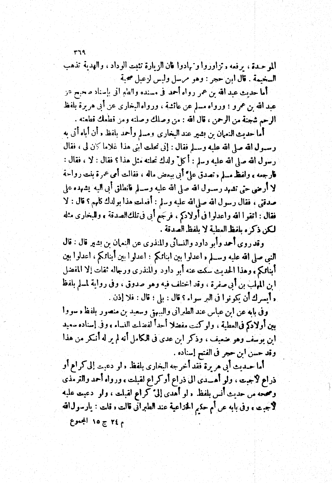 اما حديث النعمان بن بشير عند البخاري ومسلم واحمد بلفظ (ان اباه أتى بِهِ رَسُولُ اللَّهِ صَلَّى اللَّهُ عَلَيْهِ وَسَلَّمَ فَقَالَ: انى نحلت ابني هذا غلاما كان لِي، فَقَالَ رَسُولُ اللَّهِ صَلَّى اللَّهُ عَلَيْهِ وَسَلَّمَ: أكل ولدك نحلته مثل هذا؟ فقال: لا، فقال: فارجعه) ولفظ مسلم (نصدق على ابى ببعض ماله، فقالت امى عمرة بنت رواحة
