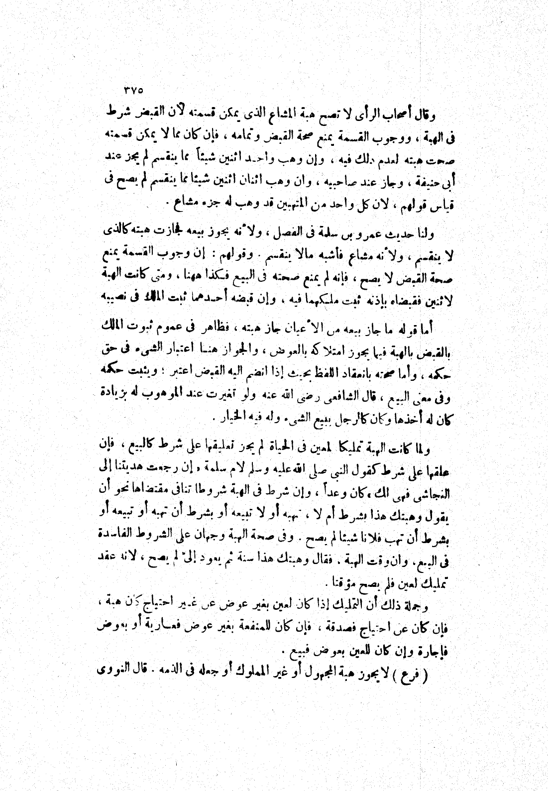 وقولهم: إن وجوب القسمة يمنع صحة القبض لا يصح، فإنه لم يمنع صحته في البيع فكذا ههنا، ومتى كانت الهبة لاثنين فقبضاه بإذنه ثبت ملكهما فيه، وإن قبضه أحدهما ثبت الملك في نصيبه أما قوله ما جاز بيعه من الاعيان جاز هبته، فظاهر في عموم ثبوت الملك بالقبض بالهبة فيما يجوز امتلاكه بالعوض، والجواز هنا اعتبار الشئ في حق حكمه، وأما صحته بانعقاد اللفظ بحيث إذا انضم إليه القبض اعتبر، ويثبت حكمه وفى معنى البيع، قال الشافعي رضى الله عنه ولو تغيرت عند الموهوب له بزيادة كان له أخذها وكان كالرجل يبيع الشئ وله فيه الخيار.