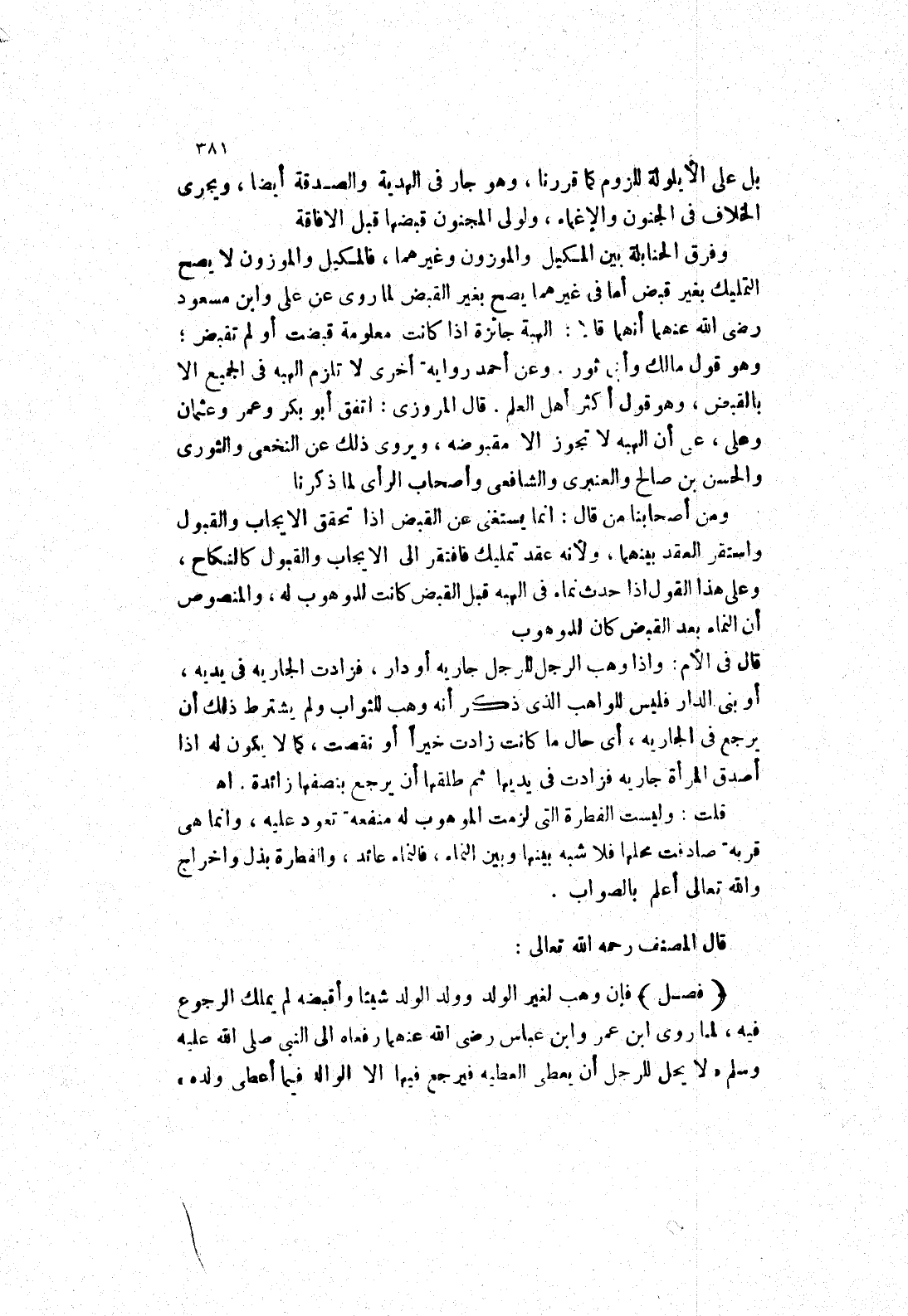 قال المروزى: اتفق أبو بكر وعمر وعثمان وعلى، على ان الهبة لا تجوز الا مقبوضة، ويروى ذلك عن النخعي والثوري والحسن بن صالح والعنبري والشافعي وأصحاب الرأى لما ذكرنا ومن أصحابنا من قال: انما يستغنى عن القبض إذا تحقق الايجاب والقبول واستقر العقد بينهما، ولانه عقد تمليك فافتقر إلى الايجاب والقبول كالنكاح، وعلى هذا القول إذا حدث نماء في الهبة قبل القبض كانت للموهوب له، والمنصوص ان النماء بعد القبض كان للموهوب قال في الام: وإذا وهب الرجل للرجل جارية أو دار، فزادت الجارية في يديه، أو بنى الدار فليس للواهب الذى ذكر انه وهب للثواب ولم يشترط ذلك ان يرجع في الجارية، أي حال ما كانت زادت خيرا أو نقصت، كما لا يكون له إذا أصدق المرأة جاريه فزادت في يديها ثم طلقها ان يرجع بنصفها زائدة.