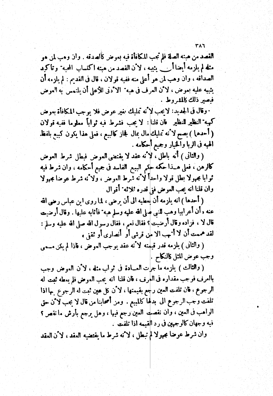 (والثالث) يلزمه ما جرت العادة في ثواب مثله، لان العوض وجب بالعرف فوجب مقداره في العرف، فان قلنا انه يجب العوض فلم يعطه ثبت له الرجوع، فان تلفت العين رجع بقيمتها، لان كل عين ثبت له الرجوع بها إذا تلفت وجب الرجوع إلى بدلها كالمبيع.