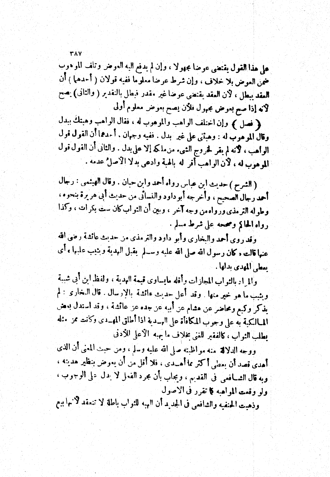 ووجه الدلالة منه مواظبته صلى الله عليه وسلم، ومن حيث المعنى أن الذى أهدى قصد أن يعطى أكثر مما أهدى، فلا أقل من أن يعوض بنظير هديته، وبه قال الشافعي في القديم، ويجاب بأن مجرد الفعل لا يدل على الوجوب، ولو وقعت المواهبه كما تقرر في الاصول وذهبت الحنفية والشافعي في الجديد أن الهبة للثواب باطلة لا تنعقد لانها بيع