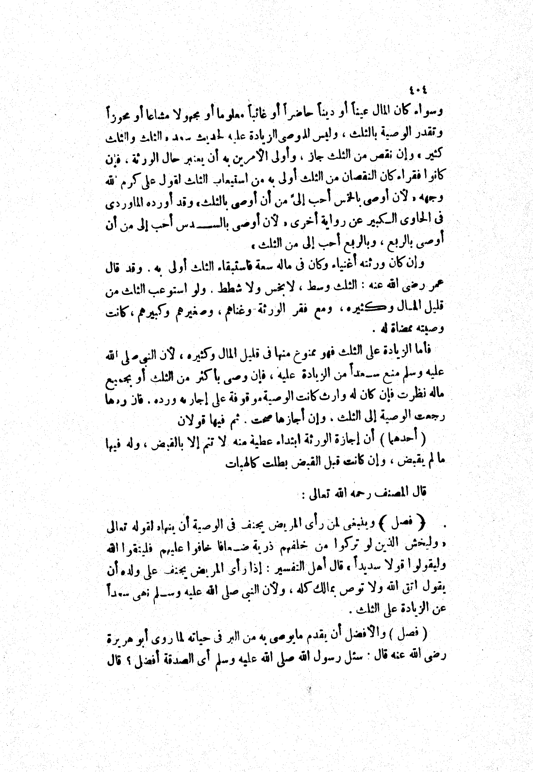 كثير) وان نقص من الثلث جاز، وأولى الامرين به أن يعتبر حال الورثة، فان كانوا فقراء كان النقصان من الثلث أولى به من استيعاب الثلث لقول على كرم الله وجهه (لان أوصى بالخمس أحب إلى من أن أوصى بالثلث) وقد أورده الماوردى في الحاوى الكبير عن رواية أخرى (لان أوصى بالسدس أحب إلى من أن أوصى بالربع، وبالربع أحب إلى من الثلث) وان كان ورثته أغنياء وكان في ماله سعة فاستبقاء الثلث أولى به.