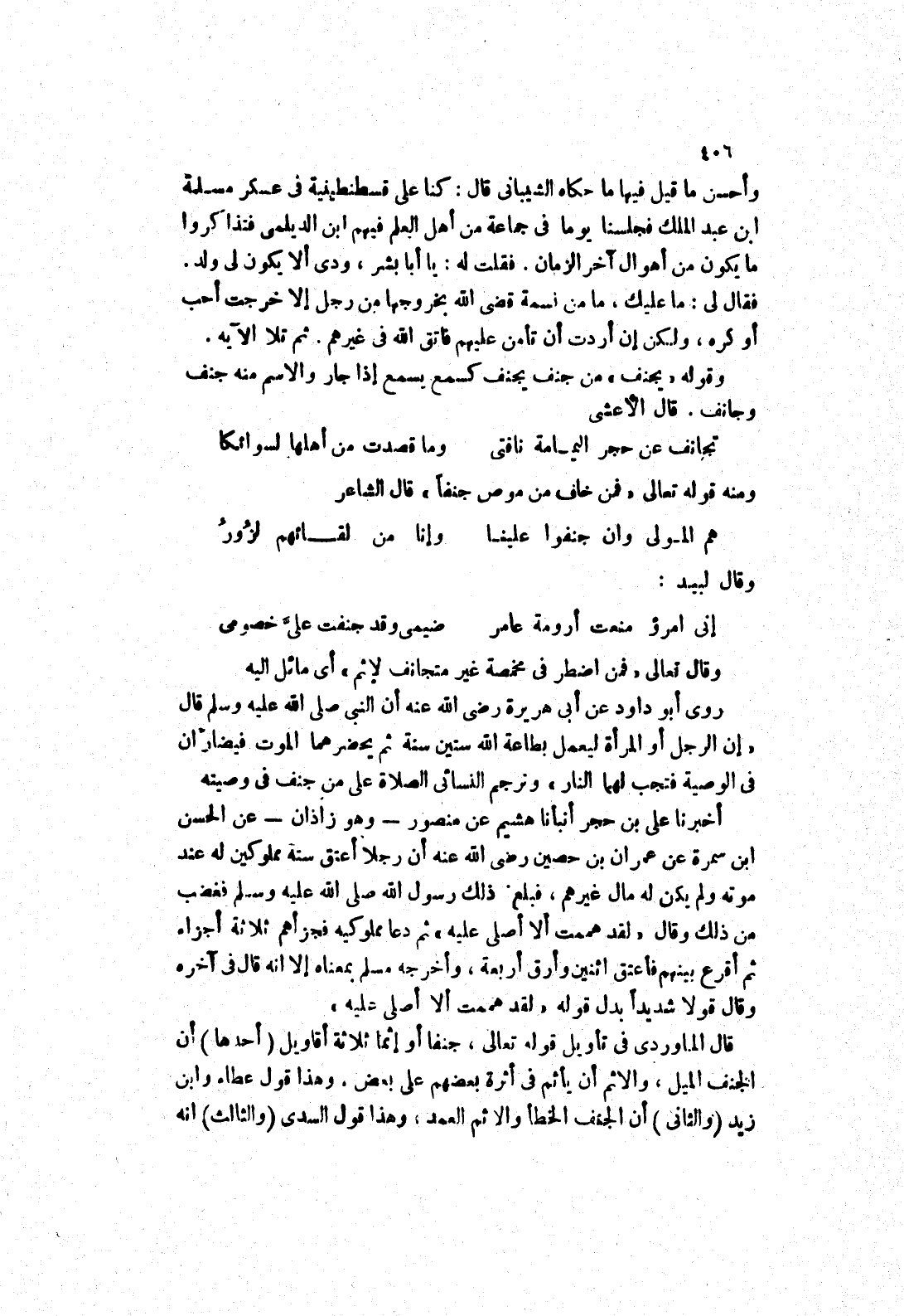 اخبرنا على بن حجر أنبأنا هشيم عن منصور - وهو زاذان - عن الحسن ابن سمرة عَنْ عِمْرَانَ بْنِ حُصَيْنٍ رَضِيَ اللَّهُ عَنْهُ ان رجلا اعتق ستة مملوكين له عند موته ولم يكن له مال غيرهم، فلغ ذَلِكَ رَسُولُ اللَّهِ صَلَّى اللَّهُ عَلَيْهِ وَسَلَّمَ فغضب من ذلك وقال (لقد هممت ألا أصلى عليه) ثم دعا مملوكيه فجزاهم ثلاثة اجزاء ثم أقرع بينهم فاعتق اثنين وارق أربعة، واخرجه مسلم بمعناه الا انه قال في آخره وقال قولا شديدا بدل قوله (لقد هممت الا أصلى عليه) قال الماوردى في تأويل قوله تعالى، جنفا أو إثما ثلاثة أقاويل