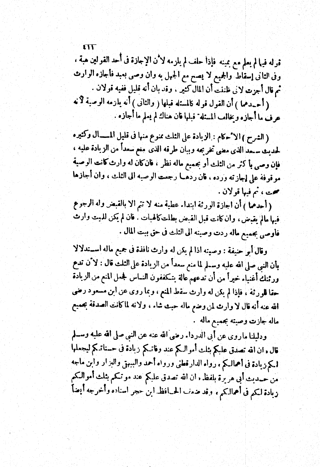 (الشرح) الاحكام: الزيادة على الثلث ممنوع منها في قليل المال وكثيره لحديث سعد الذى مضى تخريجه وبيان طرقه الذى منع سعدا من الزيادة عليه، فإن وصى بأكثر من الثلث أو بجميع ماله نظر، فان كان له وارث كانت الوصية موقوفة على إجازته ورده، فان ردها رجعت الوصيه إلى الثلث، وان أجازها صحت، ثم فيها قولان.
