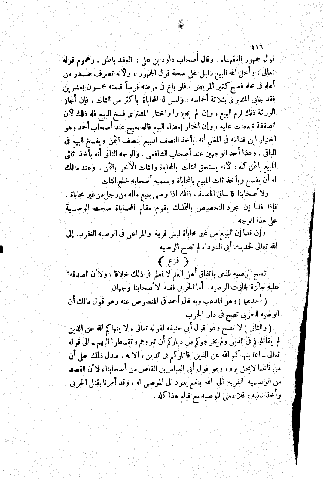 وعموم قوله تعالى: وأحل الله البيع دليل على صحة قول الجمهور، ولانه تصرف صدر من أهله في محله فصح كغير المريض، فلو باع في مرضه فرسا قيمته خمسون بعشرين فقد جابى المشترى بثلاثة أخماسه، وليس له المحاباة بأكثر من الثلث، فإن أجاز الورثة ذلك لزم البيع ن وإن لم يجيزوا واختار المشترى فسخ البيع فله ذلك لان الصفقة تبعضت عليه ن وإن اختار إمضاء البيع فالصحيح عند أصحاب أحمد وهو اختيار ابن قدامه في المغنى أنه يأخذ النصف للبيع بنصف الثمن ويفسخ البيع في الباقي.
