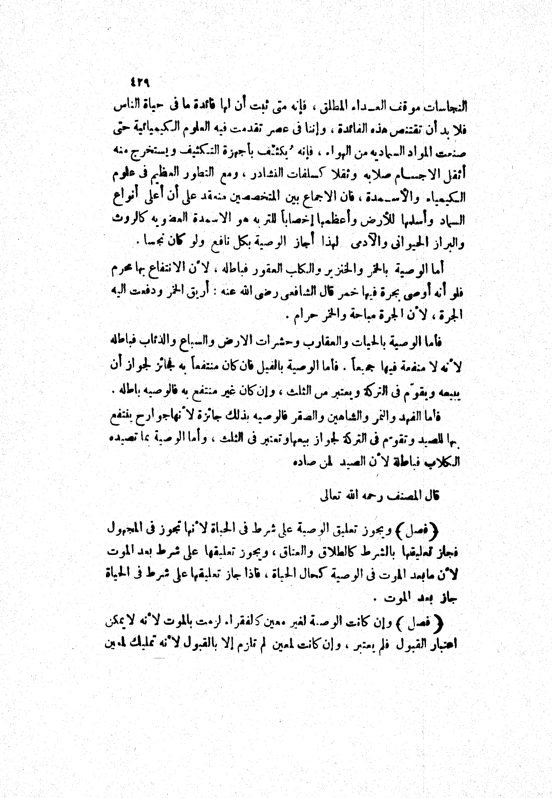 النجاسات موقف العداء المطلق، فإنه متى ثبت أن لها فائدة ما في حياة الناس فلا بد أن تقتنص هذه الفائدة، وإننا في عصر تقدمت فيه العلوم الكيمياوئية حتى صنعت المواد السمادية من الهواء، فإنه يكثف بأجهرة التكثيف وستخرج منه أثقل الاجسام صلابه وثقلا كسلفات النشادر، ومع التطور العظيم في علوم الكيمياء والاسمدة، فان الاجماع بين المتخصصين منعقد على أن أعلى أنواع السماد وأسلمها للارض وأعظمها إخصابا للتربه هو الاسمدة العضوية كالروث والبراز الحيوانى والآدمي لهذا أجاز الوصية بكل نافع ولو كان نجسا.