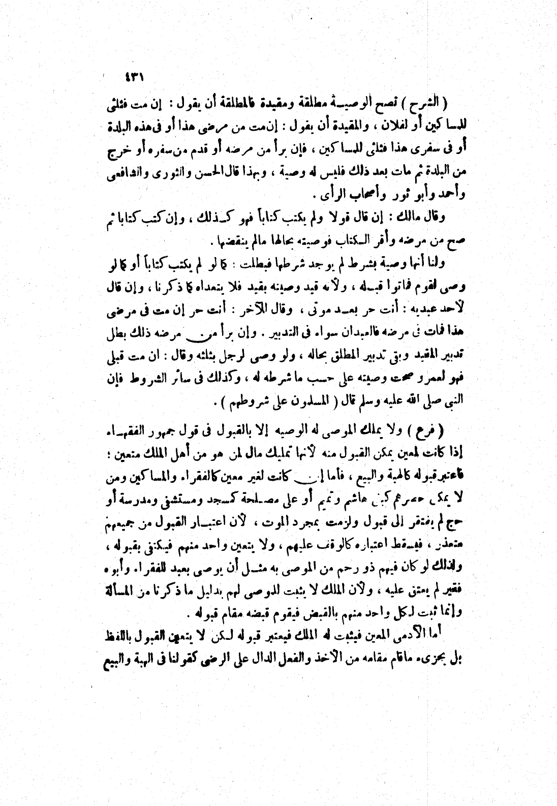 (الشرح) تصح الوصية مطلقة ومقيدة فالمطلقة أن يقول: إن مت فثلثي للمساكين أو لفلان، والمقيدة أن يقول: إن مت من مرضى هذا أو في هذه البلدة أو في سفري هذا فثلثي للمساكين، فإن برأ من مرضه أو قدم من سفره أو خرج من البدة ثم مات بعد ذلك فليس له وصية، وبهذا قال الحسن والثوري والشافعي وأحمد وأبو ثور وأصحاب الرأى.