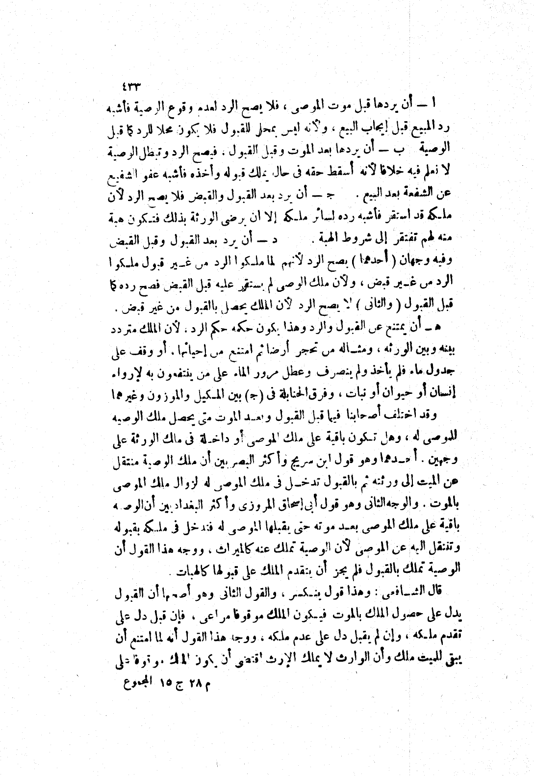 قال الشافعي: وهذا قول ينكسر، والقول الثاني وهو أصحها أن القبول يدل على حصول الملك بالموت فيكون الملك موقوفا مراعى، فان قبل دل على تقدم ملكه، وان لم يقبل دل على عدم ملكه، ووجه هذا القول انه لما امتنع ان يبقى للميت ملك وان الوارصث لا يملك الارث اقتضى أن يكون الملك موقوفا على