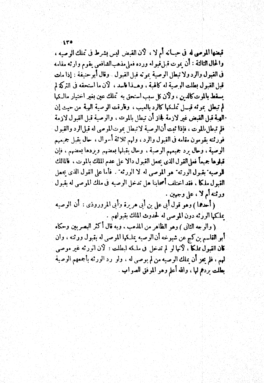 قبضها الموصى له في حياته أم لا، لان القبض ليس بشرط في تملك الوصيه، والحال الثالثة: أن يموت قبل قبوله ورده فعلى مذهب الشافعي يقوم وارثه مقامه في القبول والرد ولا تبطل الوصية بموته قبل القبول.