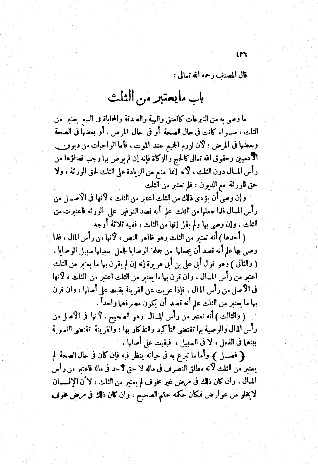 ما وصى به من التبرعات كالعتق والهبة والصدقة والمحاباة في البيع يعتبر من الثلث، سواء كانت في حال الصحة أو في حال المرض، أو بعضها في لصحة وبعضها في المرض، لان الزوم الجميع عند الموت، فأما الواجبات من ديون الآدميين وحقوق الله تعالى كالحج والزكاة فإنه إن لم يوص بها وتجب قضاؤها من رأس المال دون الثلث، لانه إنما منع من الزيادة على الثلث لحق الورثة، ولا حق للورثة مع الديون، فلم تعتبر من الثلث وإن وصى أن يؤدى ذلك من الثلث اعتبر من الثلث، لانها في الاصل من رأس المال فلما جعلها من الثلث علم أنه قصد التوفير على الورثة فاعترت من الثلث، وإن وصى بها ولم يقل إنها من الثلث، ففيه ثلاثة أوجه (أحدها) أنه تعتبر من الثلث وهو ظاهر النص، لانها من رأس المال، فلما وصى بها علم أنه قصد أن يجعلها من جملة الوصايا فجعل سبيلها سبيل الوصايا.