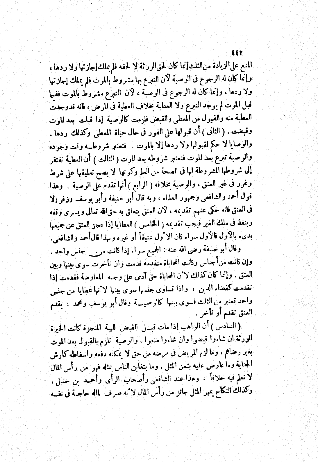 وهذا قول أحمد والشافعي وجمهور العلماء، وبه قال أبو حنيفة وأبو يوسف وزفر إلا في العتق فانه حكى عنهم تقديمه، لان العتق يتعلق به حق الله تعالى ويسرى وقفه وينفذ في ملك الغير فيجب تقديمه (الخامس) العطايا إذا عجز العتق عن جميعها بدئ بالاول فالاول سواء كان الاول عتيقا أو غيره وبهذا قال أحمد والشافعي.