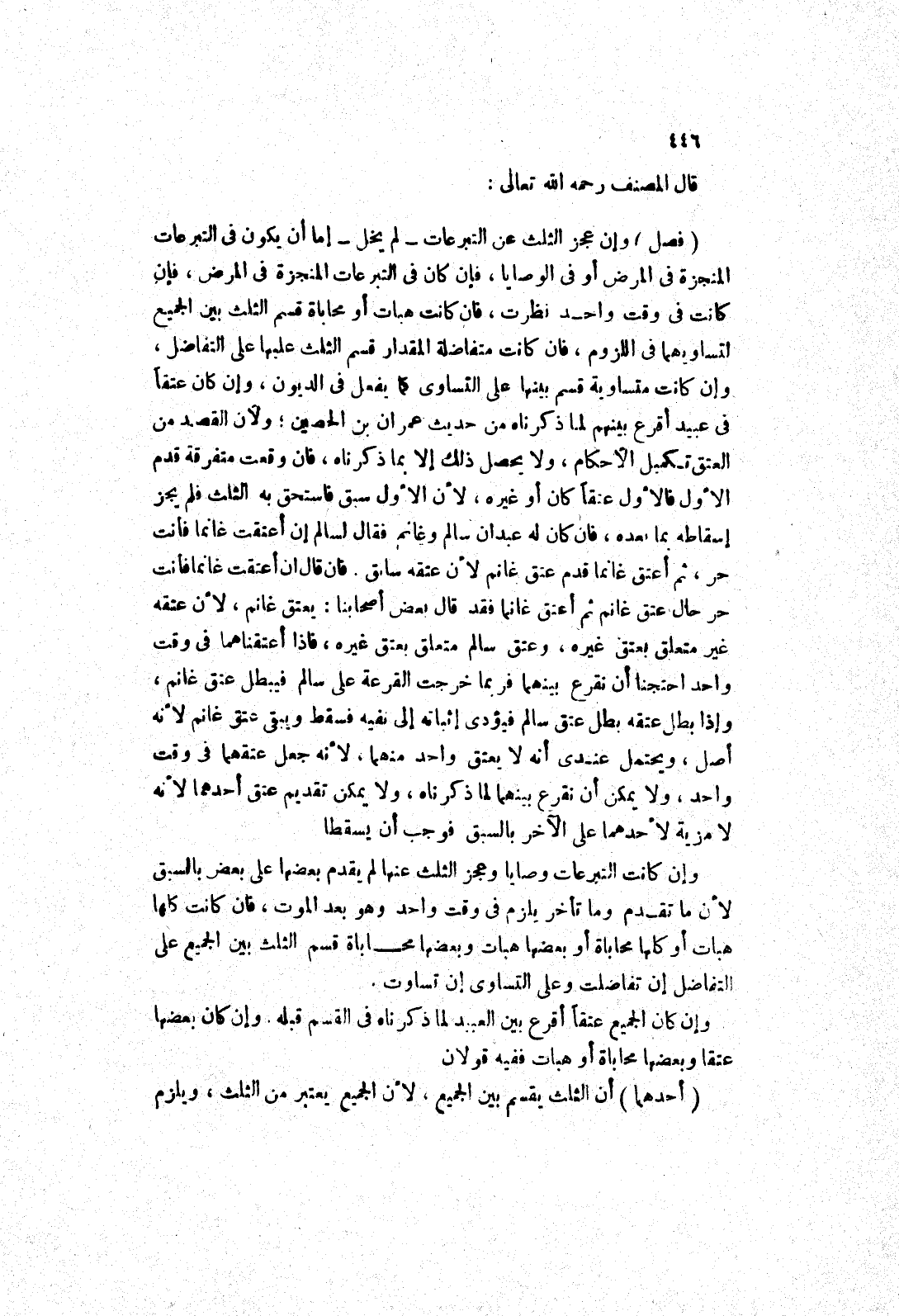 وإن عجز الثلث عن التبرعات لم يخل إما أن يكون في التبرعات المنجزة في المرض أو في الوصايا، فإن كان في التبرعات المنجزة في المرض، فإن كانت في وقت واحد نظرت، فان كانت هبات أو محاباة قسم الثلث بين الجميع لتساويهما في اللزوم، فان كانت متفاضلة المقدار قسم الثلث عليها على التفاضل، وإن كانت متساوية قسم بينها على التساوى كما يفعل في الديون ن وإن كان عتقا في عبيد أقرع بينهم لما ذكرناه من حديث عمران بن الحصين، ولان القصد من العتق تكميل الاحكام، ولا يحصل ذلك إلا بما ذكرناه، فان وقعت متفرقة قدم الاول فالاول عتقا كان أو غيره، لان الاول سبق فاستحق به الثلث فلم يجز إسقاطه بما بعده، فان كان له عبدان سالم وغانم فقال لسالم إن أعتقت غانما فأنت حر، ثم أعتق غانما قدم عتق غانم لان عتقه سابق.