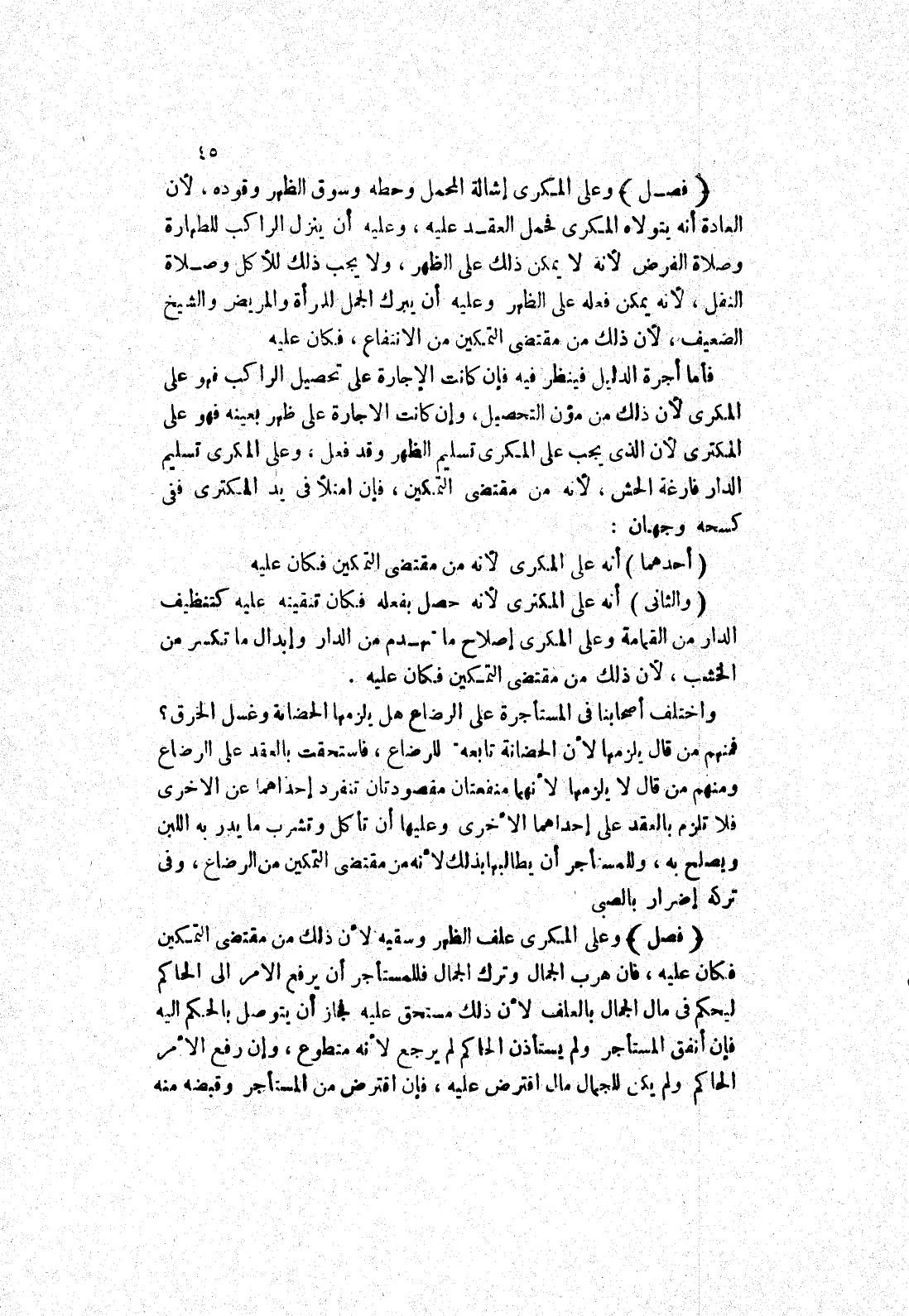 وعلى المكرى إشالة المحمل وحطه وسوق الظهر وقوده، لان العادة أنه يتولاه المكرى فحمل العقد عليه، وعليه أن ينزل الراكب للطهارة وصلاة الفرض لانه لا يمكن ذلك على الظهر، ولا يجب ذلك للاكل وصلاة النفل، لانه يمكن فعله على الظهر وعليه أن يبرك الجمل للمرأة والمريض والشيخ الضعيف، لان ذلك من مقتضى التمكين من الانتفاع، فكان عليه فأما أجرة الدليل فينظر فيه فإن كانت الاجارة على تحصيل الراكب فهو على المكرى لان ذلك من مؤن التحصيل، وإن كانت الاجارة على ظهر بعينه فهو على المكترى لان الذى يجب على المكرى تسليم الظهر وقد فعل، وعلى المكرى تسليم الدار فارغة الحش، لانه من مقتضى التمكين، فإن امتلا في يد المكترى ففى كسحه وجهان: