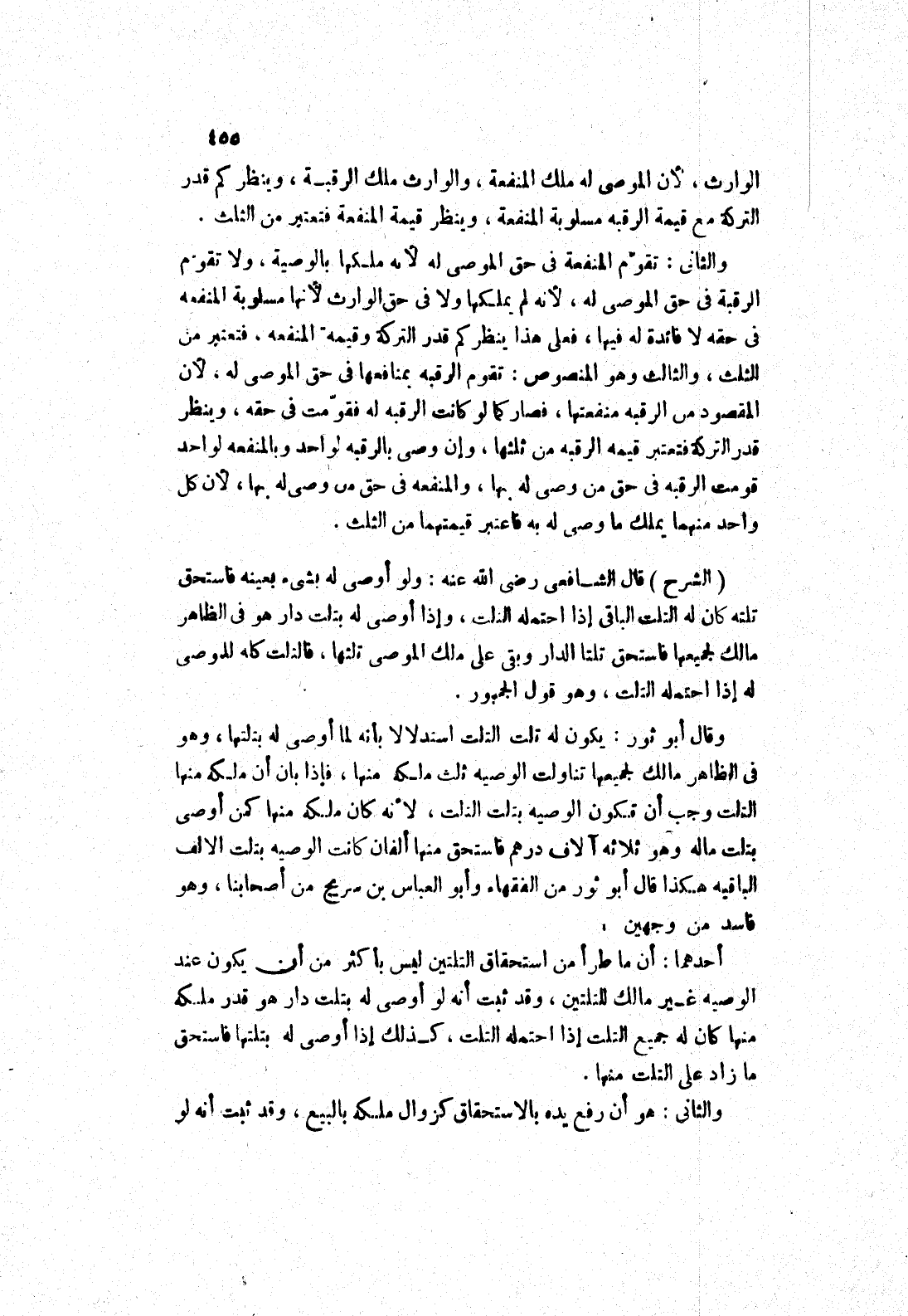 والثانى: تقوم المنفعة في حق الموصى له لانه ملكها بالوصية، ولا تقوم الرقبة في حق الموصى له، لانه لم يملكها ولا في حق الوارث لانها مسلوبة المنفعة في حقه لا فائدة له فيها، فعلى هذا ينظركم قدر التركة وقيمة المنفعة، فتعتبر من الثلث، والثالث وهو المنصوص: تقوم الرقبه بمنافعها في حق الموصى له، لان المقصود من الرقبه منفعتها، فصار كما لو كانت الرقبه له فقومت في حقه، وينظر قدر التركة فتعتبر قيمه الرقبه من ثلثها، وإن وصى بالرقبة لواحد وبالمنفعه لواحد