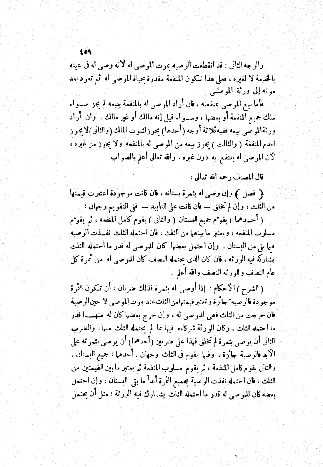 (الشرح) الاحكام: إذا أوصى له بثمرة فذلك ضربان: ان تكون الثمرة موجودة فالوصية جائزة وتعتبر قيمتها من الثلث عند موت الموصى لا حين الوصية فان خرجت من الثلث فهى للموصى له، وان خرج بعضها كان له منها قدر ما احتمله الثلث، وكان الورثة شركاءه فيها بما لم يحتمله الثلث منها والضرب الثاني ان يوصى بثمرة لم تخلق فهذا على ضربين