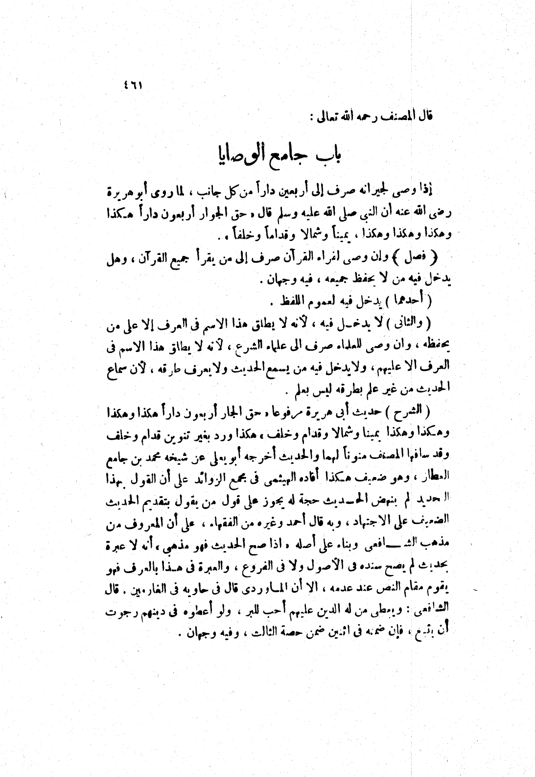 (الشرح) حديث ابى هريرة مرفوعا (حق الجار اربعون دارا هكذا وهكذا وهكذا وهكذا يمينا وشمالا وقدام وخلف) هكذا ورد بغير تنوين قدام وخلف وقد سافها المصنف منونا لهما والحديث اخرجه أبو يعلى عن شيخه محمد بن جامع العطار، وهو ضعيف هكذا افاده الهيثمى في مجمع الزوائد على ان القول بهذا الحديد لم ينهض الحديث حجة له يجوز على قول من يقول بتقديم الحديث الضعيف على الاجتهاد، وبه قال احمد وغيره من الفقهاء، على ان المعروف من مذهب الشافعي وبناء على اصله (إذا صح الحديث فهو مذهبي) انه لا عبرة بحديث لم يصح سنده في الاصول ولا في الفروع، والعبرة في هذا بالعرف فهو يقوم مقام النص عند عدمه، الا ان الماوردى قال في حاويه في الغارمين.