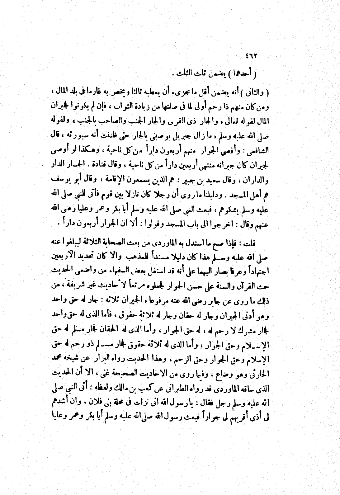 قلت: فإذا صح ما استدل به الماوردى من بعث الصحابة الثلاثة ليبلغوا عنه صلى الله عليه وسلم هذا كان دليلا مسندا للمذهب والا كان تحديد الاربعون اجتهادا وعرفا يصار اليهما على انه قد استغل بعض السفهاء من واضعى الحديث حث القرآن والسنة على حسن الجوار فجعلوه مرتعا لاحاديث غير شريفة، من ذلك ماروى عن جابر رضى الله عنه مرفوعا (الجيران ثلاثه: جار له حق واحد وهو ادنى الجيران وجار له حقان وجار له ثلاثة حقوق، فاما الذى له حق واحد فجار مشرك لا رحم له، له حق الجوار، واما الذى له الحقان فجار مسلم له حق الاسلام وحق الجوار، واما الذى له ثلاثة حقوق فجار مسلم ذو رحم له حق الاسلام وحق الجوار وحق الرحم، وهذا الحديث رواه البزار عن شيخه محمد الحارثى وهو وضاع، وفيما روى من الاحاديث الصحيحة غنى، الا ان الحديث الذى ساقه الماوردى قد رواه الطبراني عن كعب بن مالك ولفظه، أَتَى النَّبِيَّ صَلَّى اللَّهُ عَلَيْهِ وَسَلَّمَ رَجُلٌ فقال: يا رسول الله انى نزلت في محلة بنى فلان، وان أشدهم