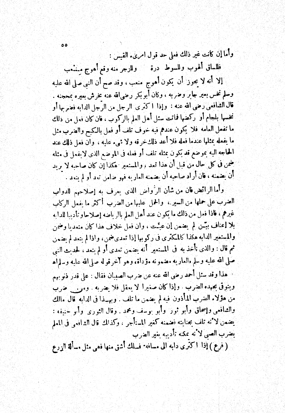 وأما الرائض فان من شأن الرواض الذى يعرف به إصلاحهم للدواب الضرب على حملها من السير، والحمل عليها من الضرب أكثر ما يفعل الركاب غيرهم، فإذا فعل من ذلك ما يكون عند اهل العلم بالرياضة اصلاحا وتأديبا للدابة بلا إعناف بين لم يضمن إن عيت، وان فعل خلاف هذا كان متعديا وضمن والمستعير الدابة هكذا كالمكترى في ركوبها إذا تعدى ضمن، وإذا لم يتعد لم يضمن ثم قال: والذى ناخذ به في المستعير انه يضمن تعدى أو لم يتعد، لحديث النبي صلى الله عليه وسلم (العارية مضمونه مؤداة) وهو آخر قوله صلى الله عليه وسلم اه هذا وقد سئل احمد رضى الله عنه عن ضرب الصبيان فقال: على قدر ذنوبهم ويتوقى يجهده الضرب.