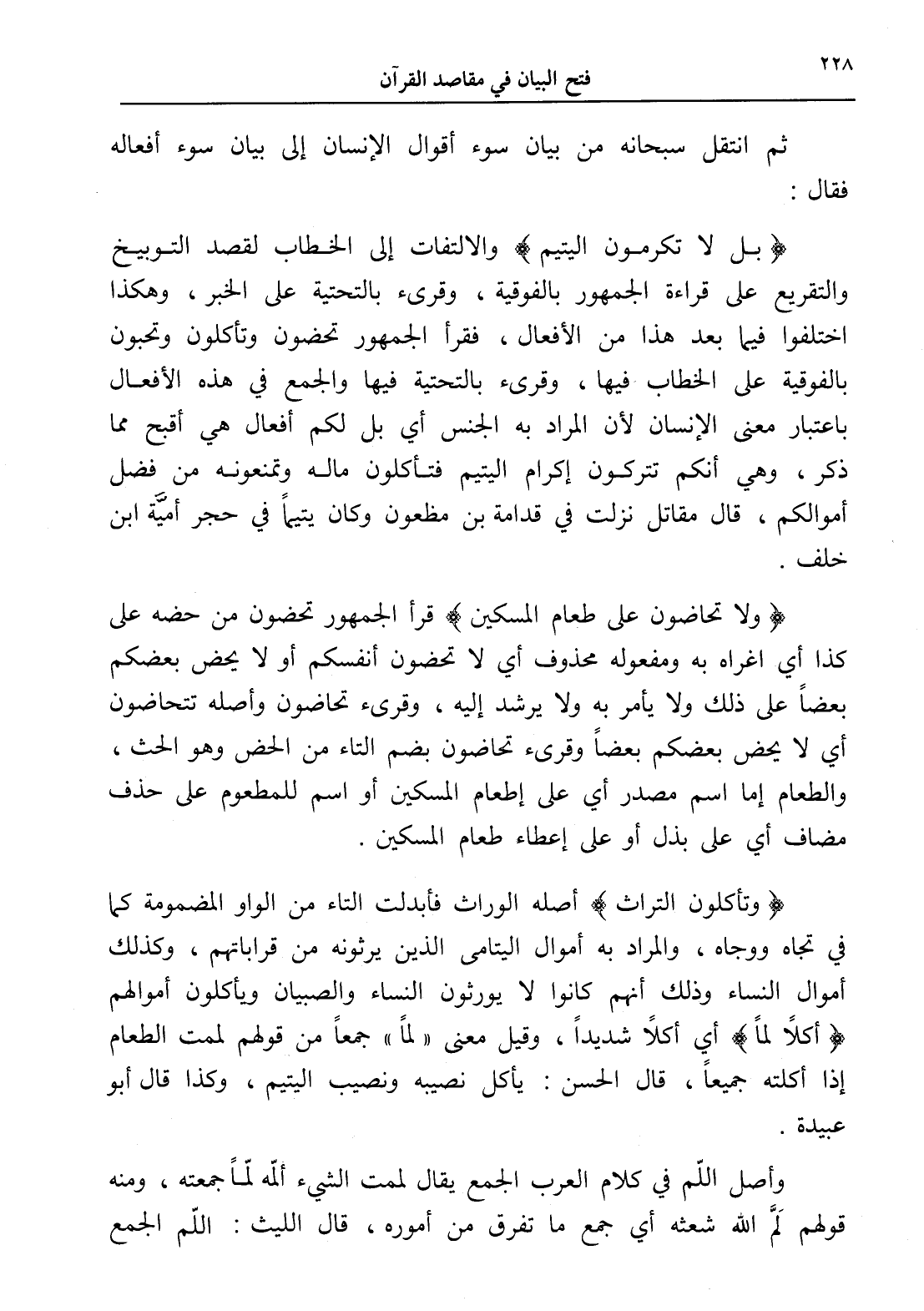 (بل لا تكرمون اليتيم) والالتفات إلى الخطاب لقصد التوبيخ والتقريع على قراءة الجمهور بالفوقية، وقرىء بالتحتية على الخبر، وهكذا اختلفوا فيما بعد هذا من الأفعال، فقرأ الجمهور تحضون وتأكلون وتحبون بالفوقية على الخطاب فيها، وقرىء بالتحتية فيها والجمع في هذه الأفعال باعتبار معنى الإنسان لأن المراد به الجنس أي بل لكم أفعال هي أقبح مما ذكر، وهي أنكم تتركون إكرام اليتيم فتأكلون ماله وتمنعونه من فضل أموالكم، قال مقاتل نزلت في قدامة بن مظعون وكان يتيماً في حجر أميَّة ابن خلف.