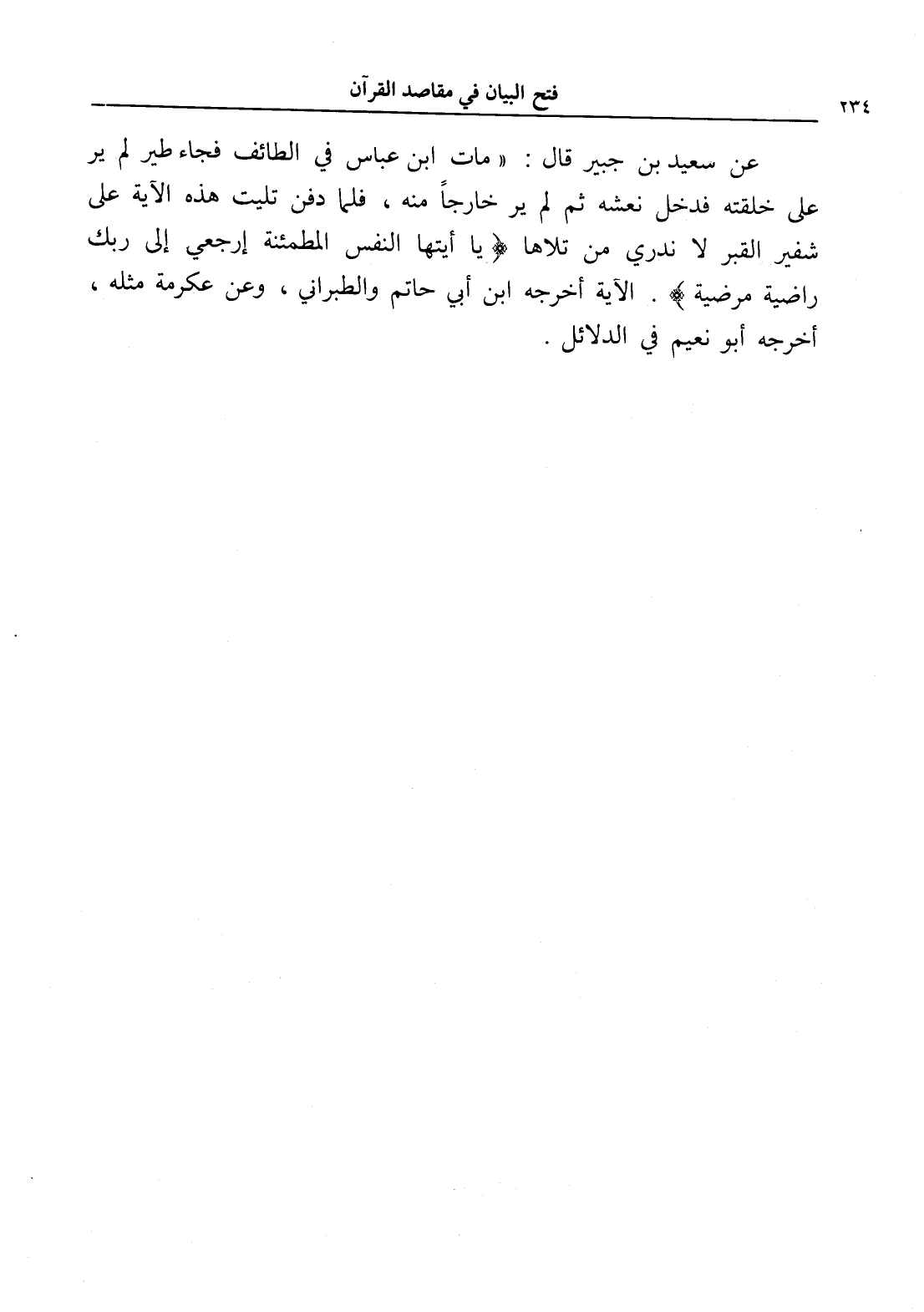 عن سعيد بن جبير قال: " مات ابن عباس في الطائف فجاء طير لم ير على خلقته فدخل نعشه ثم لم ير خارجاً منه، فلما دفن تليت هذه الآية على شفير القبر لا ندري من تلاها (يَا أَيَّتُهَا النَّفْسُ الْمُطْمَئِنَّةُ (27) ارْجِعِي إِلَى رَبِّكِ رَاضِيَةً مَرْضِيَّةً). الآية أخرجه ابن أبي حاتم والطبراني، وعن عكرمة مثله، أخرجه أبو نعيم في الدلائل.