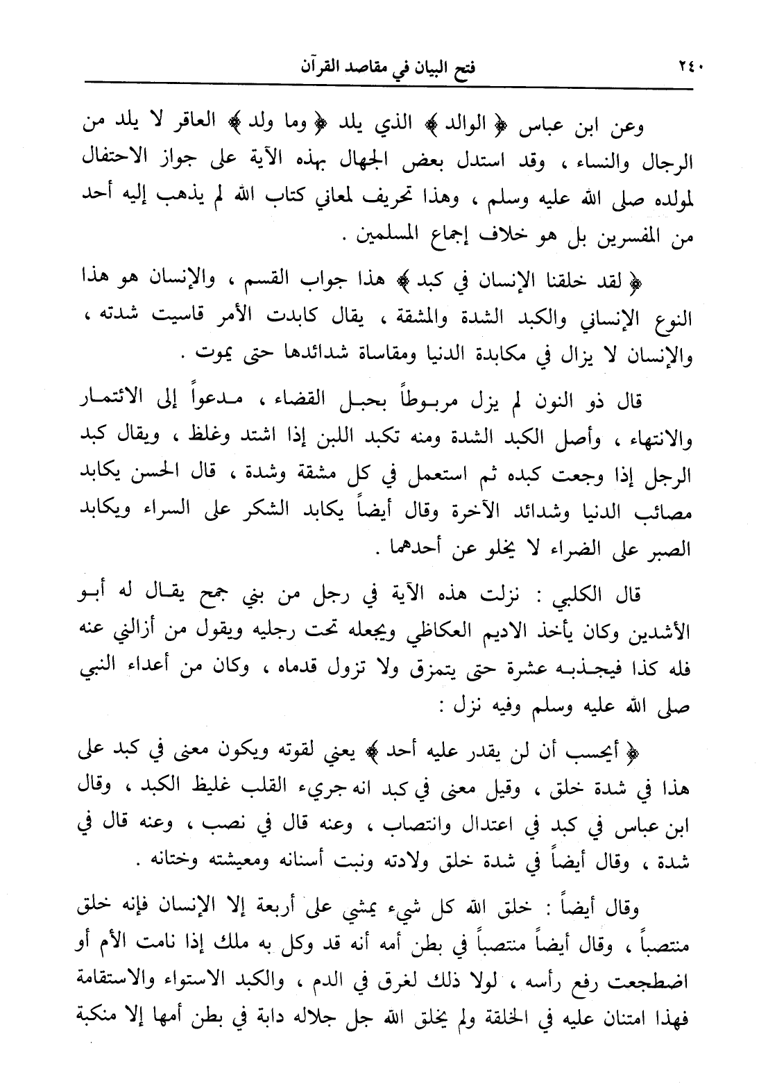 (أيحسب أن لن يقدر عليه أحد) يعني لقوته ويكون معنى في كبد على هذا في شدة خلق، وقيل معنى في كبد أنه جريء القلب غليظ الكبد، وقال ابن عباس في كبد في اعتدال وانتصاب، وعنه قال في نصب، وعنه قال في شدة، وقال أيضاًً في شدة خلق ولادته ونبت أسنانه ومعيشته وختانه.