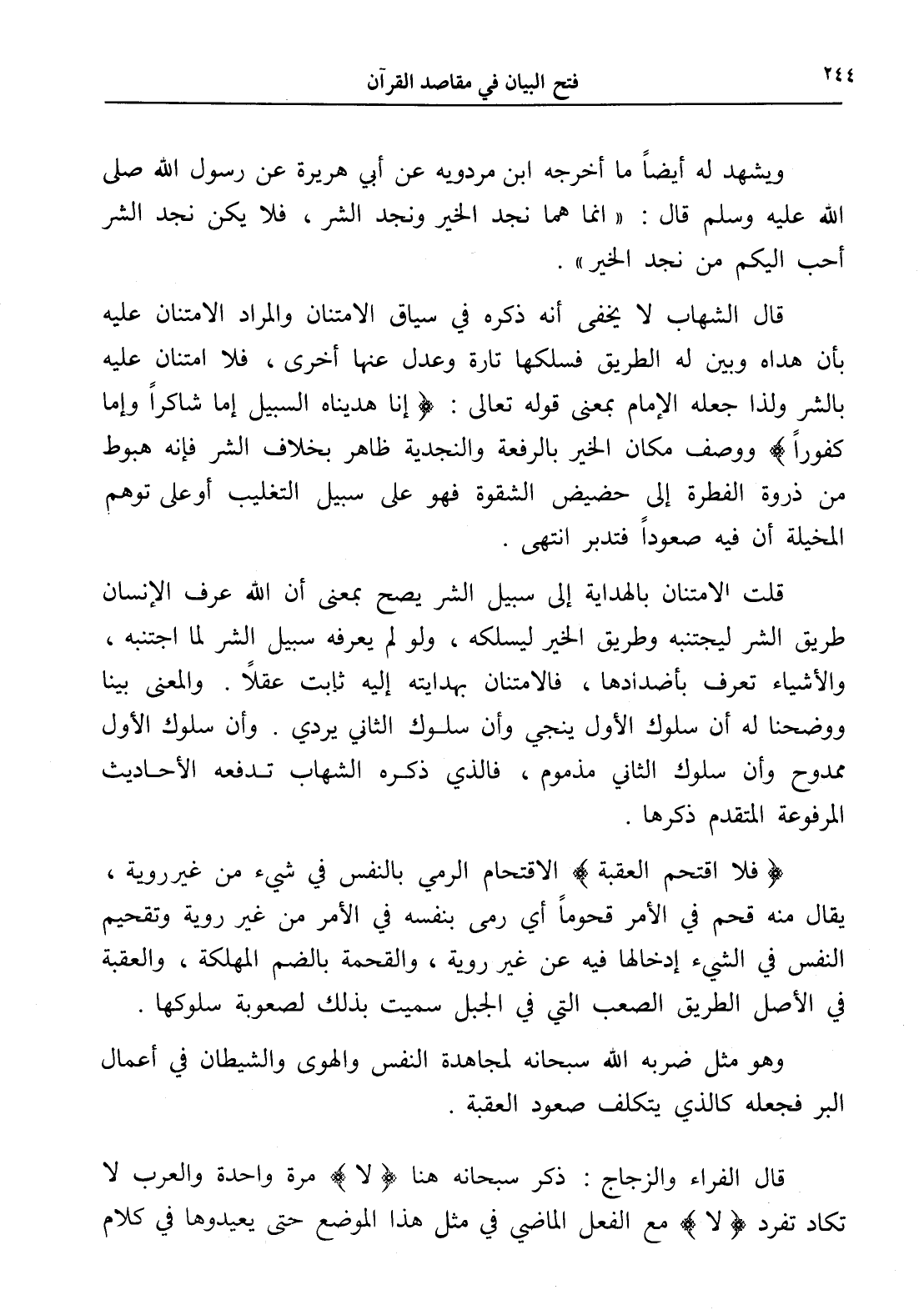 قلت الامتنان بالهداية إلى سبيل الشر يصح بمعنى أن الله عرف الإنسان طريق الشر ليجتنبه وطريق الخير ليسلكه، ولو لم يعرفه سبيل الشر لما اجتنبه، والأشياء تعرف بأضدادها، فالامتنان بهدايته إليه ثابت عقلاً. والمعنى بينا ووضحنا له أن سلوك الأول ينجي وأن سلوك الثاني يردي. وأن سلوك الأول ممدوح وأن سلوك الثاني مذموم، فالذي ذكره الشهاب تدفعه الأحاديث المرفوعة المتقدم ذكرها.