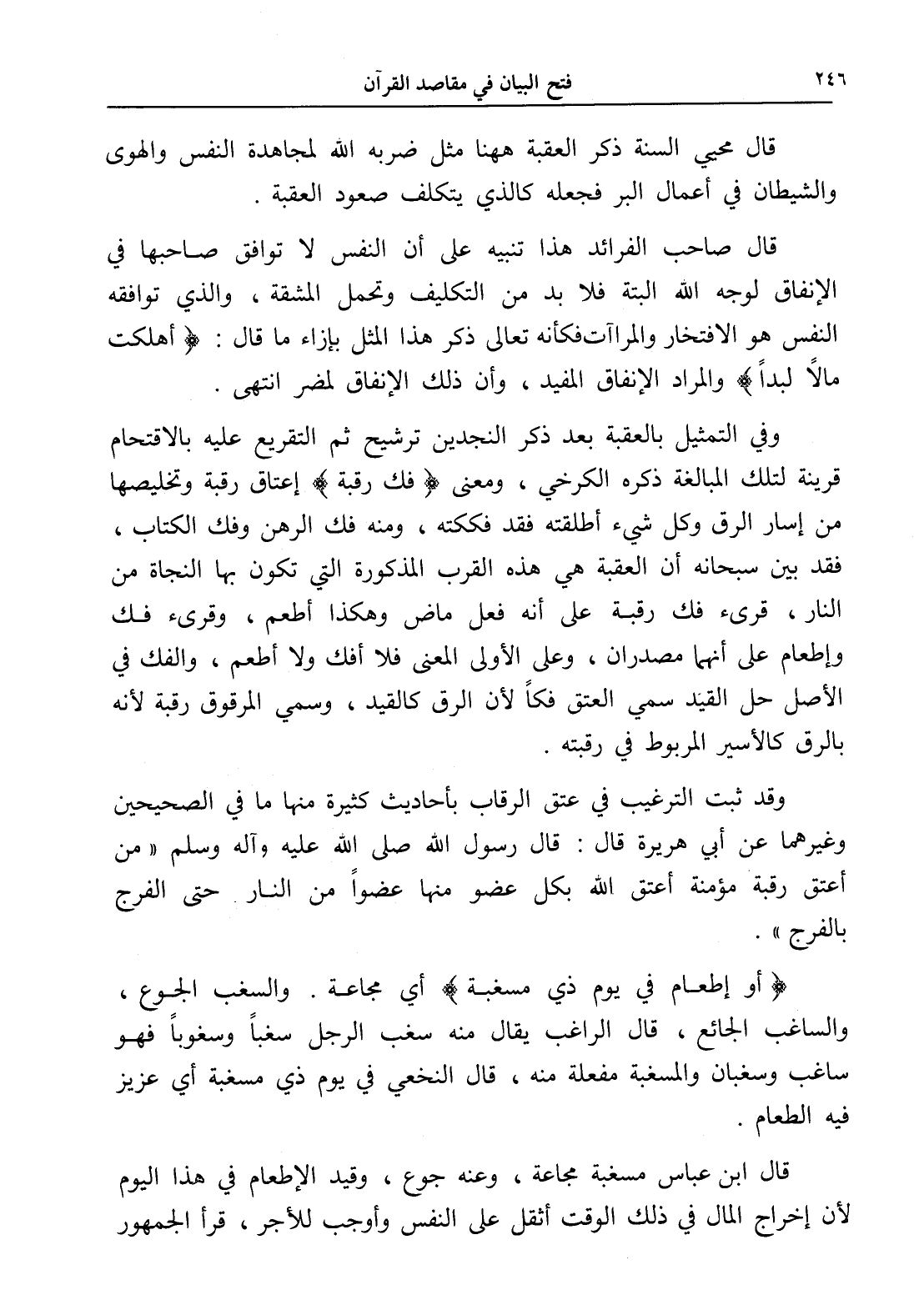 وفي التمثيل بالعقبة بعد ذكر النجدين ترشيح ثم التقريع عليه بالاقتحام قرينة لتلك المبالغة ذكره الكرخي، ومعنى (فك رقبة) إعتاق رقبة وتخليصها من إسار الرق وكل شيء أطلقته فقد فككته، ومنه فك الرهن وفك الكتاب، فقد بين سبحانه أن العقبة هي هذه القرب المذكورة التي تكون بها النجاة من النار، قرىء فك رقبة على أنه فعل ماض وهكذا أطعم، وقرىء فك وإطعام على أنهما مصدران، وعلى الأولى المعنى فلا أفك ولا أطعم، والفك في الأصل حل القيد سمي العتق فكاً لأن الرق كالقيد، وسمي المرقوق رقبة لأنه بالرق كالأسير المربوط في رقبته.