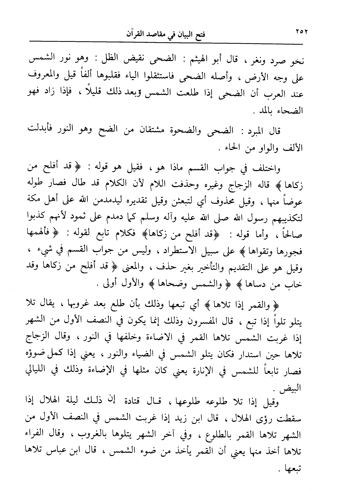 واختلف في جواب القسم ماذا هو، فقيل هو قوله: (قد أفلح من زكاها) قاله الزجاج وغيره وحذفت اللام لأن الكلام قد طال فصار طوله عوضاً منها، وقيل محذوف أي لتبعثن وقيل تقديره ليدمدمن الله على أهل مكة لتكذيبهم رسول الله صلى الله عليه وآله وسلم كما دمدم على ثمود لأنهم كذبوا صالحاً، وأما قوله: (قد أفلح من زكاها) فكلام تابع لقوله: (فألهمها فجورها وتقواها) على سبيل الاستطراد، وليس من جواب القسم في شيء، وقيل هو على التقديم والتأخير بغير حذف، والمعنى (قد أفلح من زكاها وقد خاب من دساها) (والشمس وضحاها) والأول أولى.