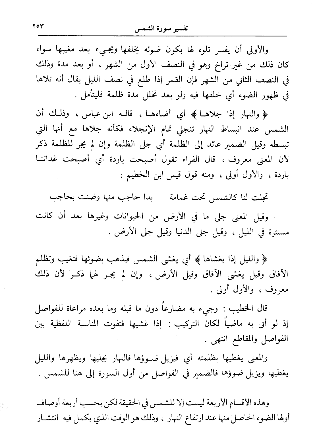 (والنهار إذا جلاها) أي أضاءها، قاله ابن عباس، وذلك أن الشمس عند انبساط النهار تنجلي تمام الإنجلاء فكأنه جلاها مع أنها التي تبسطه وقيل الضمير عائد إلى الظلمة أي جلى الظلمة وإن لم يجر للظلمة ذكر لأن المعنى معروف، قال الفراء تقول أصبحت باردة أي أصبحت غداتنا باردة، والأول أولى، ومنه قول قيس ابن الخطيم: