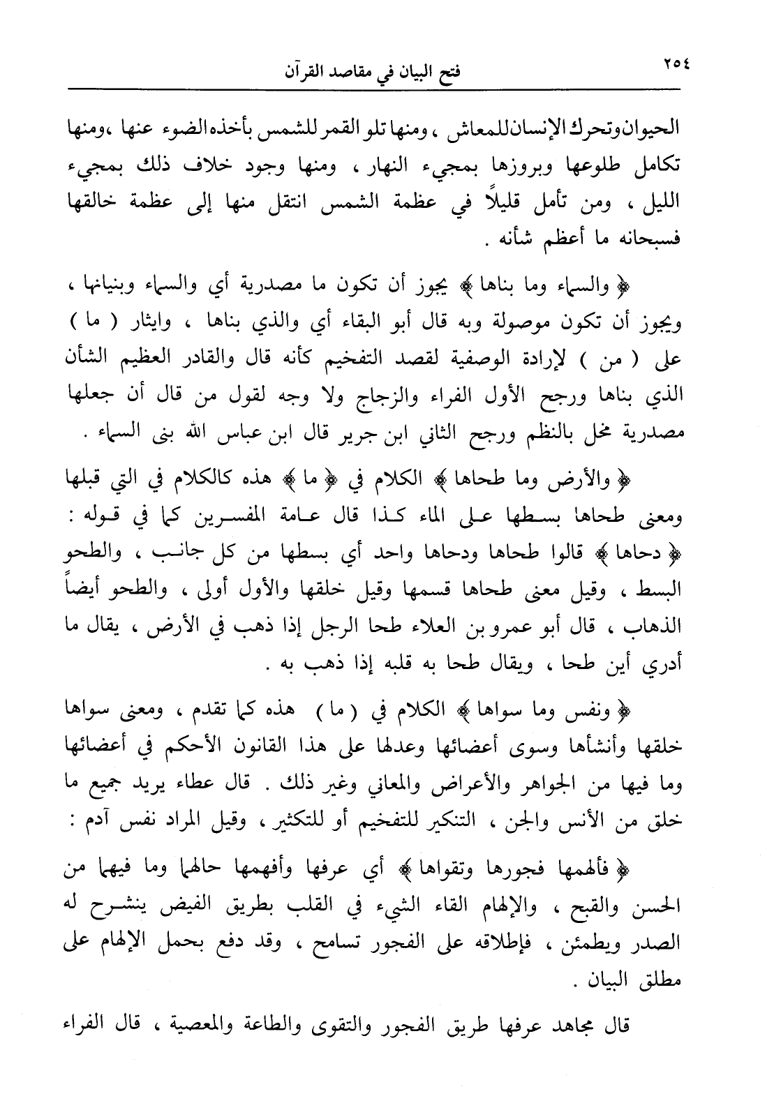 (والأرض وما طحاها) الكلام في (ما) هذه كالكلام في التي قبلها ومعنى طحاها بسطها على الماء كذا قال عامة المفسرين كما في قوله: (دحاها) قالوا طحاها ودحاها واحد أي بسطها من كل جانب، والطحو البسط، وقيل معنى طحاها قسمها وقيل خلقها والأول أولى، والطحو أيضاًً الذهاب، قال أبو عمرو بن العلاء طحا الرجل إذا ذهب في الأرض، يقال ما أدري أين طحا، ويقال طحا به قلبه إذا ذهب به.