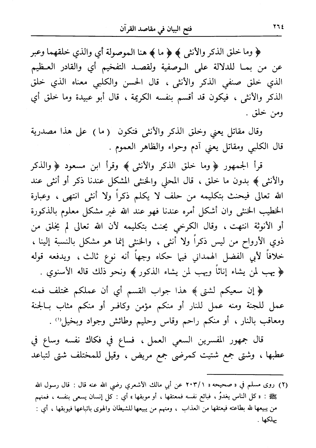 قرأ الجمهور (وما خلق الذكر والأنثى) وقرأ ابن مسعود (والذكر والأنثى) بدون ما خلق، قال المحلي والخنثى المشكل عندنا ذكر أو أنثى عند الله تعالى فيحنث بتكليمه من حلف لا يكلم ذكراً ولا أنثى انتهى، وعبارة الخطيب الخنثى وإن أشكل أمره عندنا فهو عند الله غير مشكل معلوم بالمذكورة أو الأنوثة انتهت، وقال الكرخي يحنث بتكليمه لأن الله تعالى لم يخلق من ذوي الأرواح من ليس ذكراً ولا أنثى، والخنثى إنما هو مشكل بالنسبة إلينا، خلافاً لأبي الفضل الهمداني فيما حكاه وجهاً أنه نوع ثالث، ويدفعه قوله (يهب لمن يشاء إناثاً ويهب لمن يشاء الذكور) ونحو ذلك قاله الأسنوي.