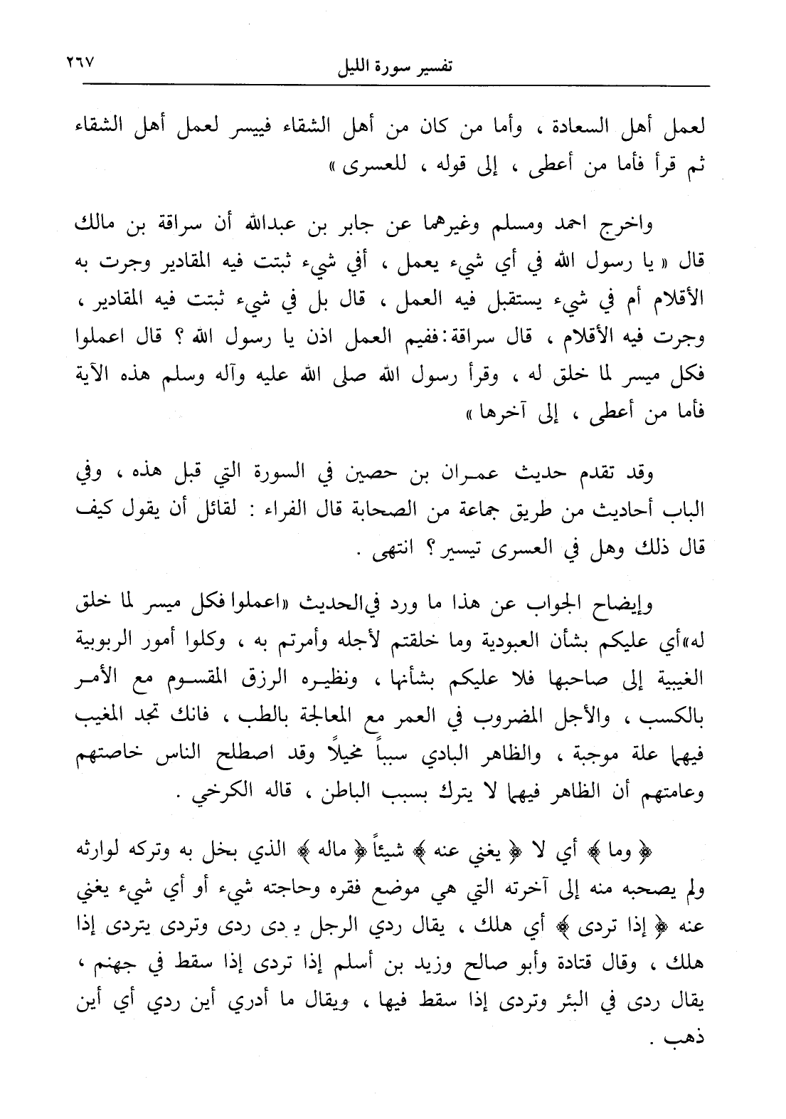 وأخرج أحمد ومسلم وغيرهما عن جابر بن عبد الله أن سراقة بن مالك قال " يا رسول الله في أي شيء يعمل، أفي شيء ثبتت فيه المقادير وجرت به الأقلام أم في شيء يستقبل فيه العمل، قال بل في شيء ثبتت فيه المقادير، وجرت فيه الأقلام، قال سراقة: ففيم العمل إذن يا رسول الله؟ قال اعملوا فكل ميسر لما خلق له، وقرأ رسول الله صلى الله عليه وآله وسلم هذه الآية فأما من أعطى، إلى آخرها ".