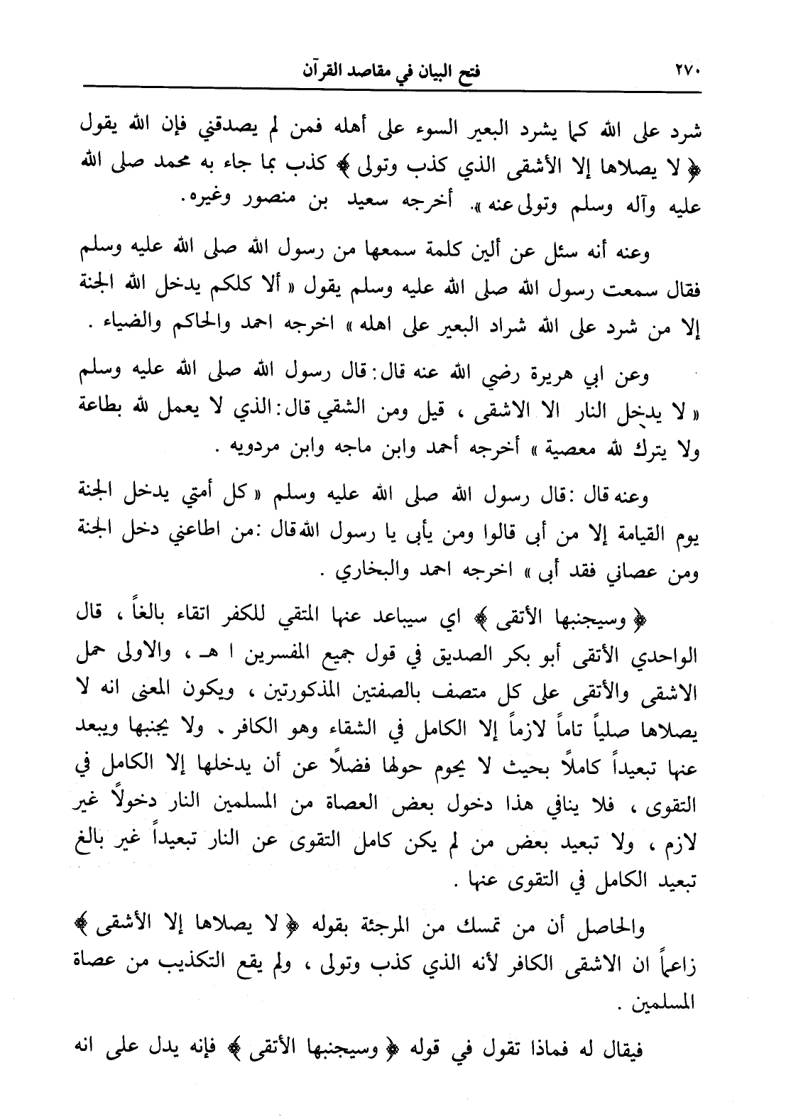 شرد على الله كما يشرد البعير السوء على أهله فمن لم يصدقني فإن الله يقول (لا يصلاها إلا الأشقى الذي كذب وتولى) كذب بما جاء به محمد صلى الله عليه وآله وسلم وتولى عنه ". أخرجه سعيد بن منصور وغيره.