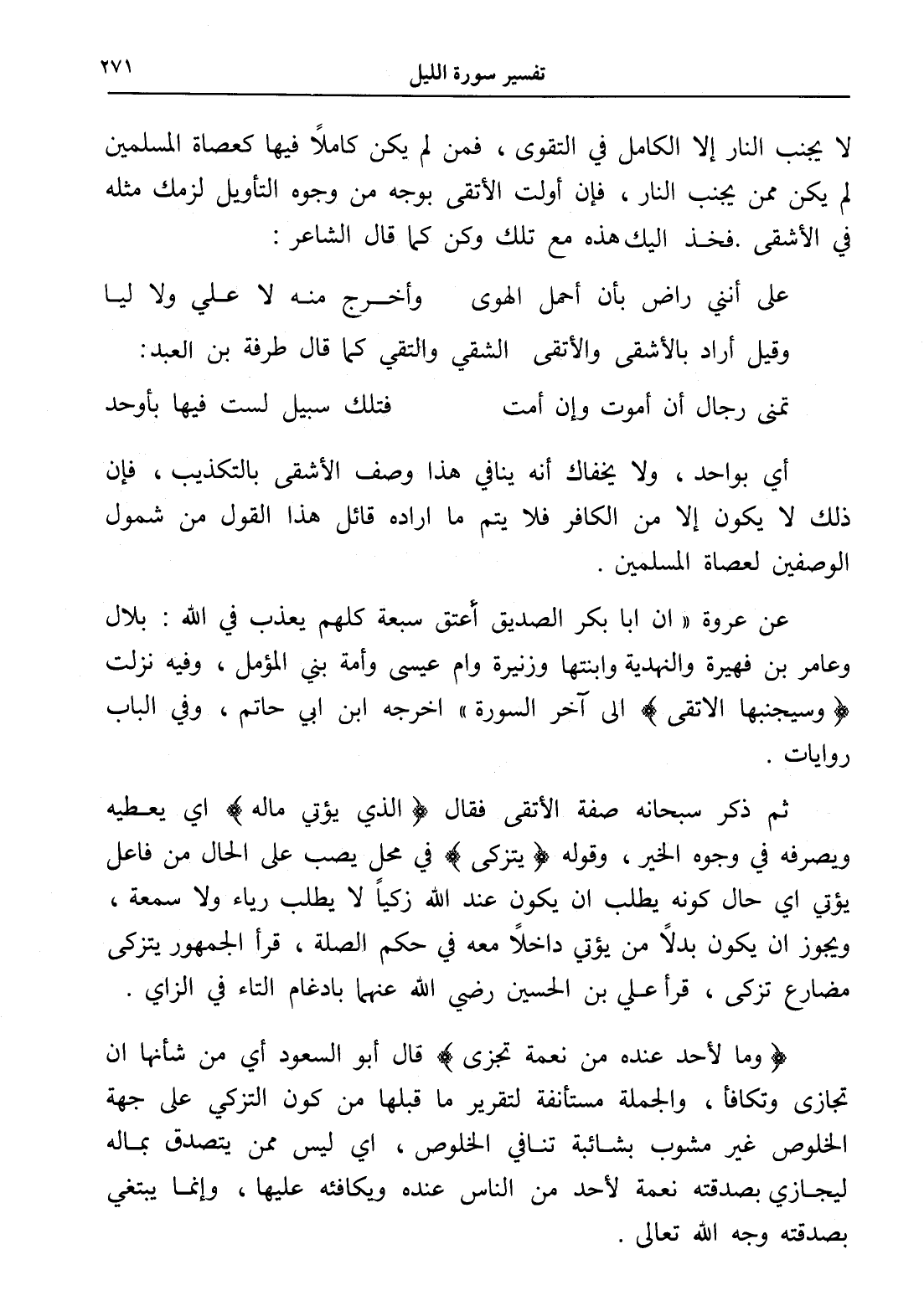 (وما لأحد عنده من نعمة تجزى) قال أبو السعود أي من شأنها أن تجازى وتكافأ، والجملة مستأنفة لتقرير ما قبلها من كون التزكي على جهة الخلوص غير مشوب بشائبة تنافي الخلوص، أي ليس ممن يتصدق بماله ليجازي بصدقته نعمة لأحد من الناس عنده ويكافئه عليها، وإنما يبتغي بصدقته وجه الله تعالى.
